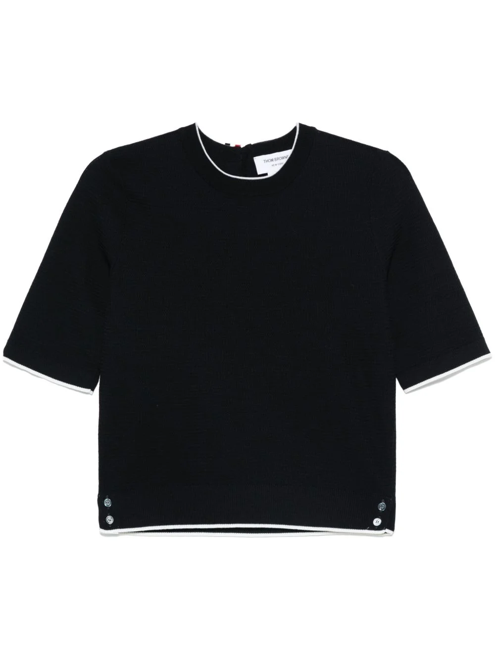 textured wool T-shirt Highlights - Navy blue - Rear button fastening - Crew neck - Short sleeves - Signature grosgrain loop tab Made in Italy Composition Virgin Wool 100% SIZE & FIT Model measurements Height 5 ft 11 in(1.8 m) Bust/Chest 31.49 in(80 cm) Hips 35.82 in(91 cm) Waist 24.8 in(63 cm) FittingInformation Designed for a slim fit that sits just away from the body offering a close yet comfortable fit Made with a midweight knit, this piece offers some stretch Washing instructions Dry Clean Only