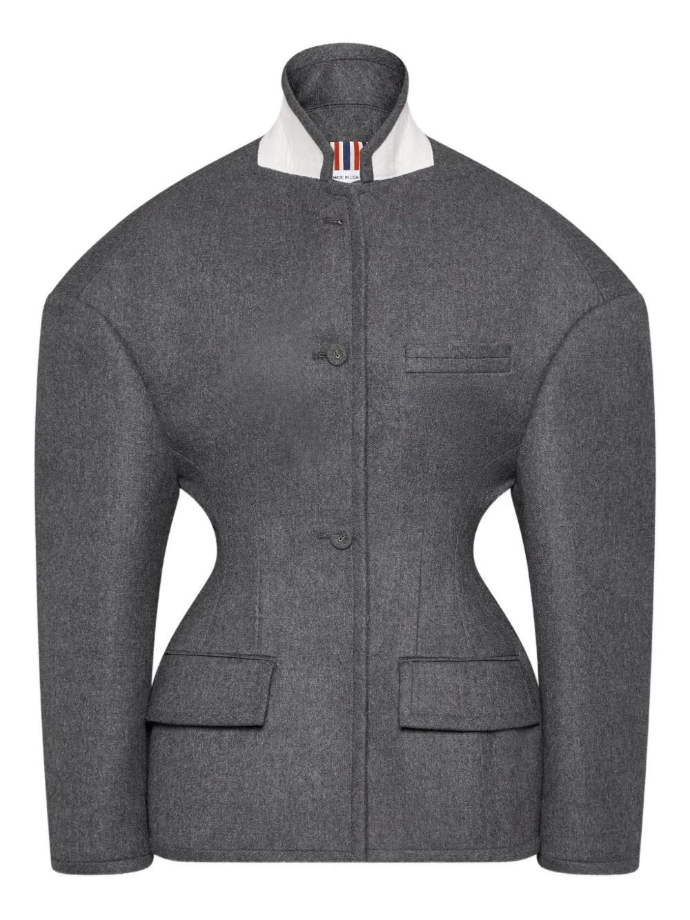 wool flannel jacket Highlights - Grey - Fitted waist - Button fastening - Padded shoulders - Flap pockets Made in Italy Composition Fabric 100% Washing instructions Read Manufacturer Guidelines
