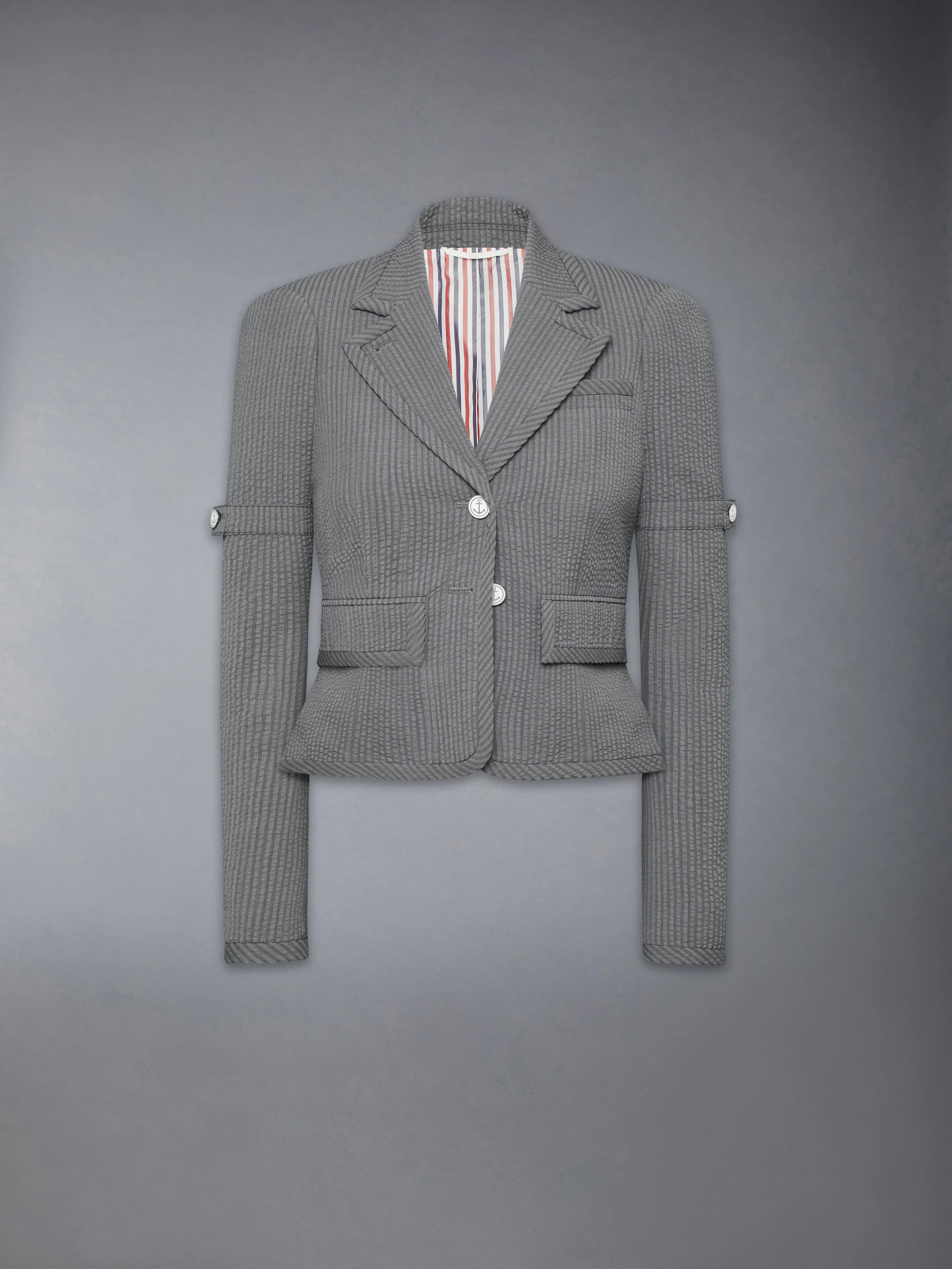 At the intersection of classic codes and the season’s abbreviated proportions, this wool seersucker jacket introduces shifted lines that reshape the familiar. The lightweight cloth brings a crisp texture to the forward-pressed shoulder line, departing from traditional tailoring with a raglan-inspired twist drawn from varsity shapes and American sportswear. Style with the matching dropped-waist skirt to echo the collection’s paranormal proportions. Front button closure Button-down point collar Patch chest pocket Button-fastening self armbands Contrast buttoned French cuffs Pleated back yoke with locker loop Curved hem Name tag applique Signature striped grosgrain loop tab Classic fit Model is 5'10" (178 cm), wearing size 40 100% Wool Lining: 100% Cupro Made in Italy FBR067B-06455-055
