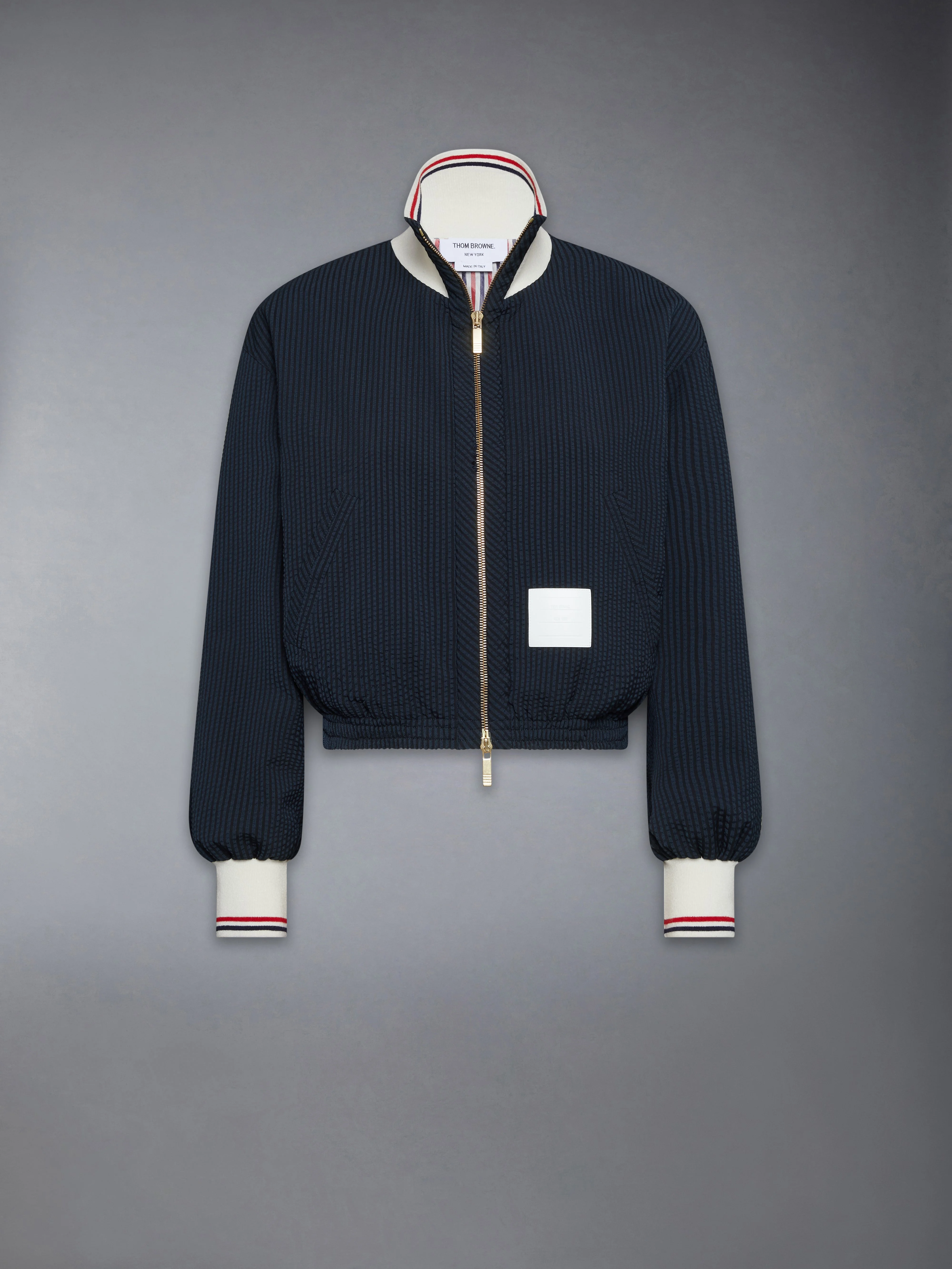 Cut in extra-fine wool seersucker, this zip-up track jacket blends crisp suiting cues with athletic inspiration. Lightweight and breathable, the fabric is woven with the signature crinkle stripe that adds texture and movement while holding its shape. Pair with the matching Wool Seersucker Drawstring Pleated Mini Skirt for a sporty take on uniform dressing. Front two-way zip closure Ribbed stand collar with RWB tipping Welt hand pockets with hidden snap Ribbed cuffs with RWB tipping Elasticated hem Tricolor lining Name tag applique Signature striped grosgrain loop tab Model is 5'10" (178 cm), wearing size 40 100% Wool Made in Italy FBC952A-06455-415