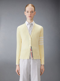 Two Thom Browne emblems define our Classic Cashmere 4-Bar V-neck Cardigan — grosgrain trim and 4-Bar stripe detailing, both synonymous with the brand. Presented in 100% rich cashmere, this cardigan exudes sophistication. V-neckline Front button closure with striped grosgrain placket 4-bar stripe detail at left sleeve Buttoned side vents and cuffs with signature striped grosgrain trim Signature striped grosgrain loop tab at back of neck Model is 5' 10" (178cm), wearing size 40 100% Cashmere Made in the UK FKC001A-00011-720