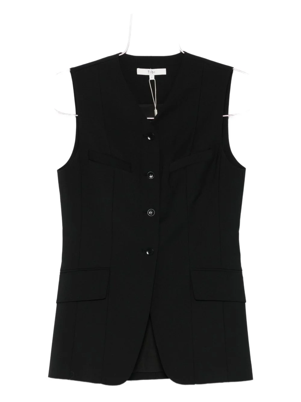 V-neck waistcoat Highlights - Black - Front button fastening - Sleeveless - Front pockets - V-neck Imported Composition Polyester 53%, Wool 43%, Elastane 4% Washing instructions Read Manufacturer Guidelines