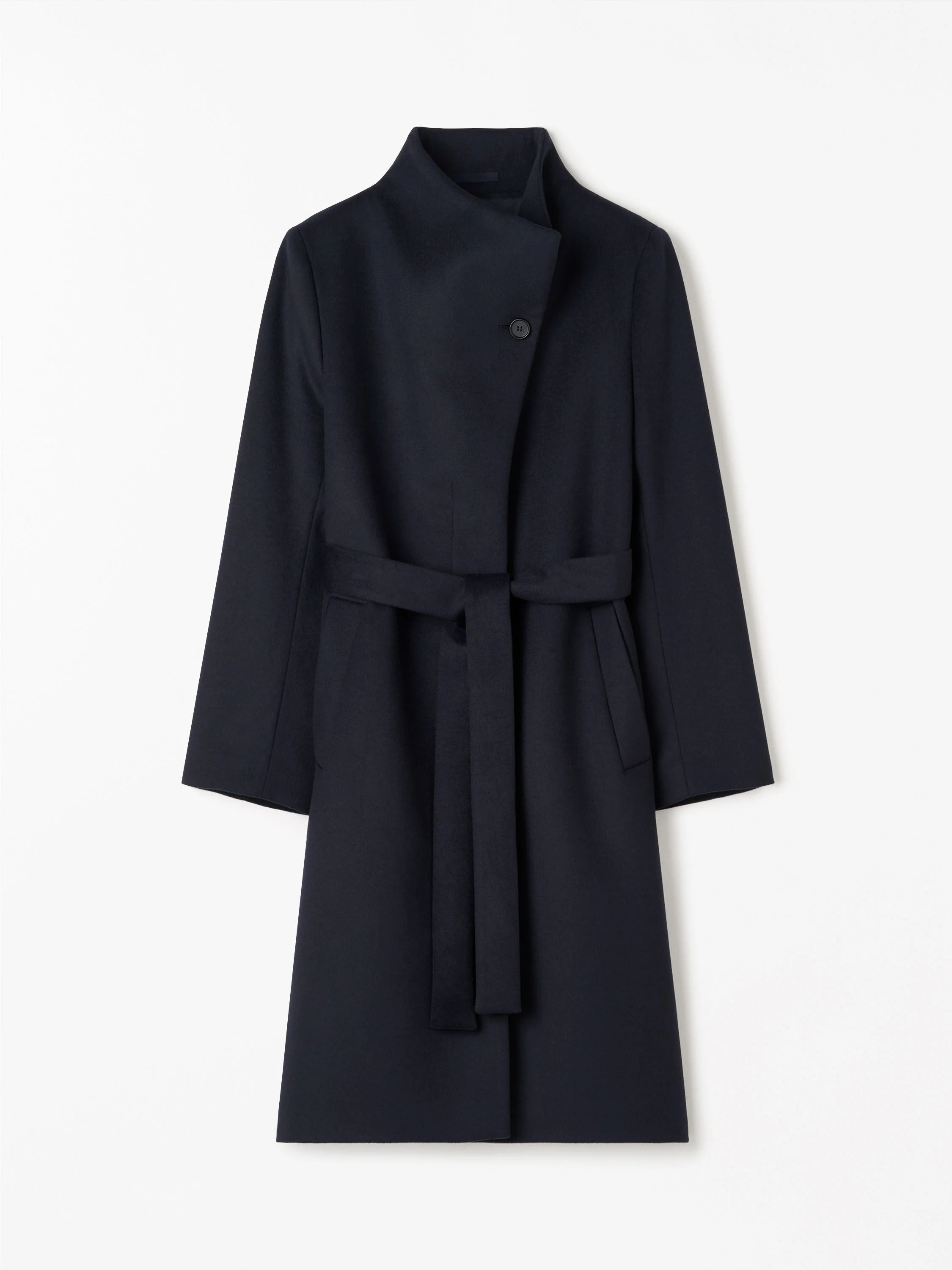Product Details - 60% Wool Recycled, 27% Polyester, 10% Cashmere Recycled, 3% Other Fibres - Straight-fit coat in classic cashmere-wool blend - Minimalistic design and knee length - Protective, asymmetric high-funnel neckline - Neckline buttons up or turn down into wide lapel - Hidden buttons at front - Clean-finish welt pockets at front - Waist can be cinched with shell-fabric belt - Fully lined - Made in Romania - Model is 175 cm and wearing a size 36 - Art No.110942284