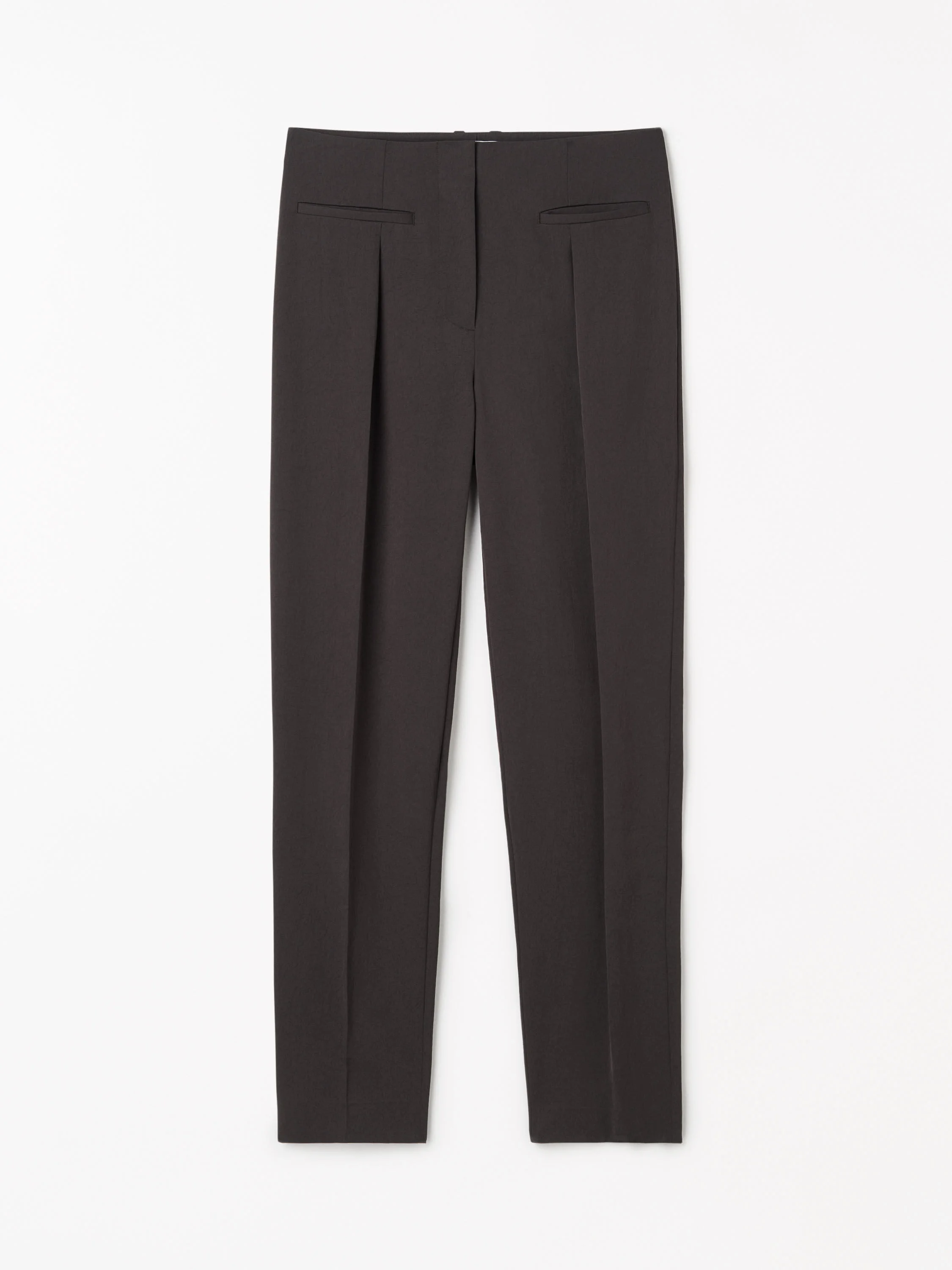 The Elliot trousers are crafted from a semi-drapy midweight fabric that offers both structure and fluidity. Designed with a relaxed fit and a subtly tapered silhouette, they sit comfortably at the mid waist for a modern yet timeless look. The front features a clean finish, while the back is detailed with practical belt loops. A zip fly with a hook-and-bar closure ensures a secure and sleek fastening. Thoughtful design elements include welt pockets at the front, neatly pressed pleats, and sharp crease lines along both the front and back, adding a refined, tailored touch to this versatile wardrobe staple. Product Details - 65% Triacetate, 35% Elastomultiester - Trousers in a semi-drapy midweight fabric - Relaxed fit with slightly tapered silhouette - Mid waist with clean finish at front and waistband with belt loops at back - Fly with zipper and hook&bar closure at front - Welt pockets at front - Pleats at front - Crease lines at front and back - Made in China - Model is 177 cm and wearing a size 36 - To complete the look, wear it with Marie Sweater and Conci Bag - Art No.11339303H