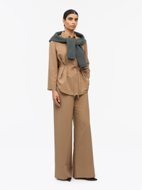 These trousers are made from a tailored, drapey midweight fabric that combines structure with ease. Featuring a relaxed fit and a subtly flared silhouette, they sit at a mid waist with an elasticated back for added comfort. The front is finished with a zip fly and a hook-and-bar closure, while attached tie straps and belt loops at the waist offer adjustable styling. Slanted front pockets and welt pockets at the back provide functional detailing, and the high folded hem adds a refined, contemporary touch. Product Details - 91% Viscose (LENZING (TM) ECOVERO (TM) ), 8% Polyamide, 1% P olyester - Trousers in a tailored drapy midweight fabric - Relaxed fit with slightly flared silhouette - Mid waist with elasticated back part for comfort - Fly with zipper and hook & bar closure at front - Attached tie straps and beltloops at front waist - Slanted front pockets - Welt pockets at back - Folded high bottom hem - Made in China - Model is 177 cm and wearing a size 36 - For a complete look, wear it with Felix Shirt - Art No.1137181Z4