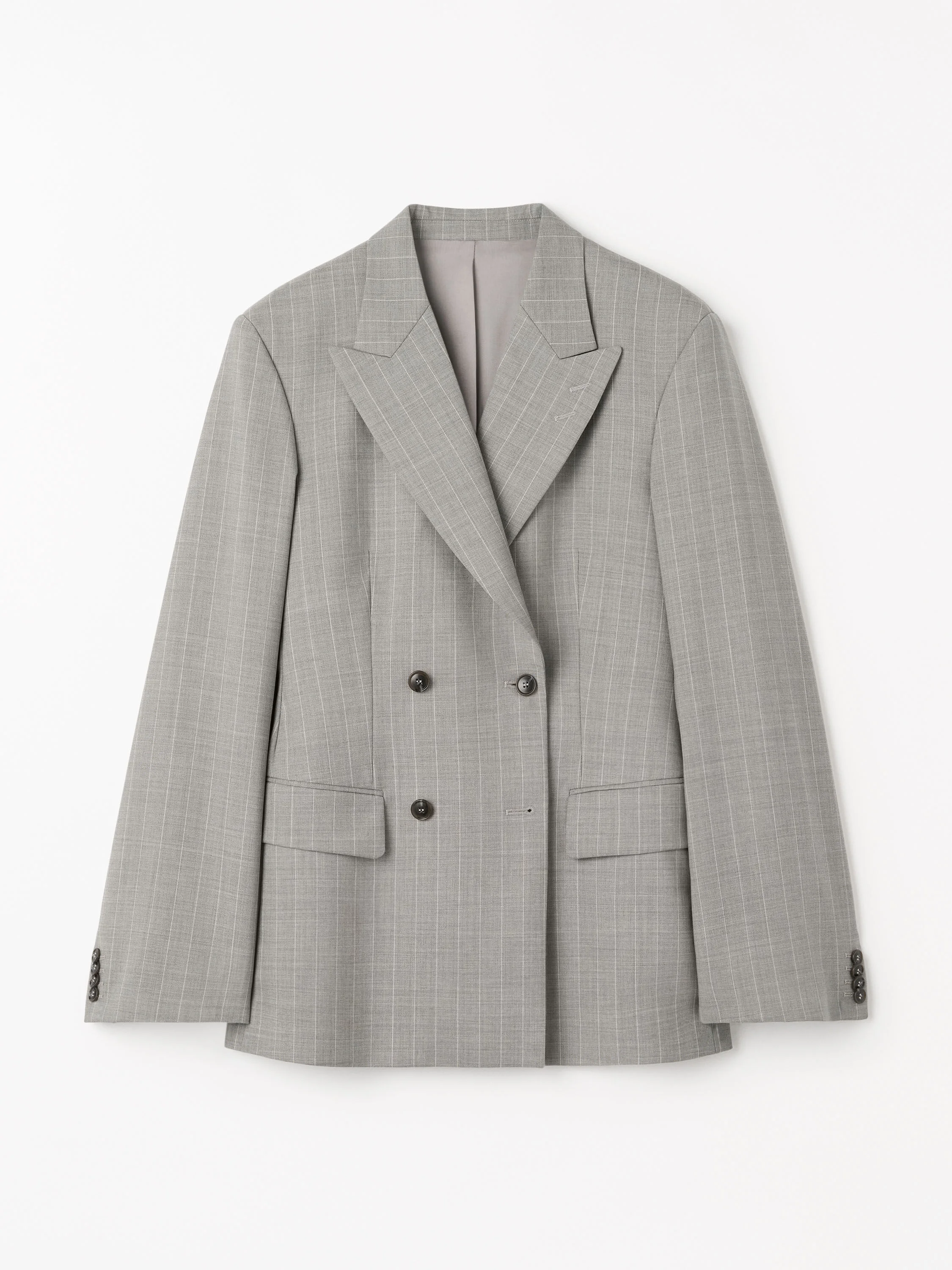 The Elmi blazer is a sophisticated peak-lapel design, tailored in a classic pinstripe 100% wool fabric. This double-breasted blazer features relaxed shoulders and a cinched waistline for a flattering silhouette. Details include a single vent at the centre back, welt pockets with flaps, and kissing buttons at the sleeve vent. Fully lined for comfort, it also includes an interior pocket. ToS's signature double buttonholes on the lapel add a distinctive finishing touch. Product Details - 100% Virgin Wool - Profile peak-lapel blazer cut in a pinstripe 100% wool fabric - Double breasted blazer - Relaxed shoulder and narrow waistline - Single vent at center back - Welt pockets with flaps - Kissing buttons at sleeve vent - Fully lined with inside pocket - ToS signiture double buttonholes on lapel - Made in Romania - Model is 177 cm and wearing a size 36 - For a complete suit look, wear it with Juli Trousers and Aminha Sweater - Art No.113273002