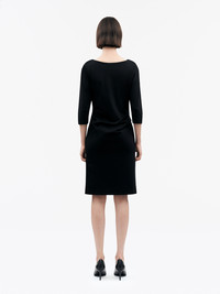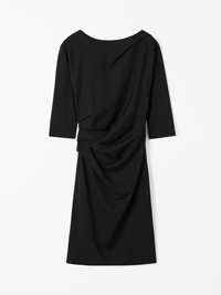 Product Details - 69% Viscose, 26% Polyamide, 5% Elastane - Slim Fit - Draped dress in compact stretch-jersey - Slightly dropped shoulders with three-quarter length sleeves - Above-knee length - Concealed zip closure - Draping at waist - Fully lined - Made in Romania - Model is 179 cm and wearing a size 36 - Art No.109786050