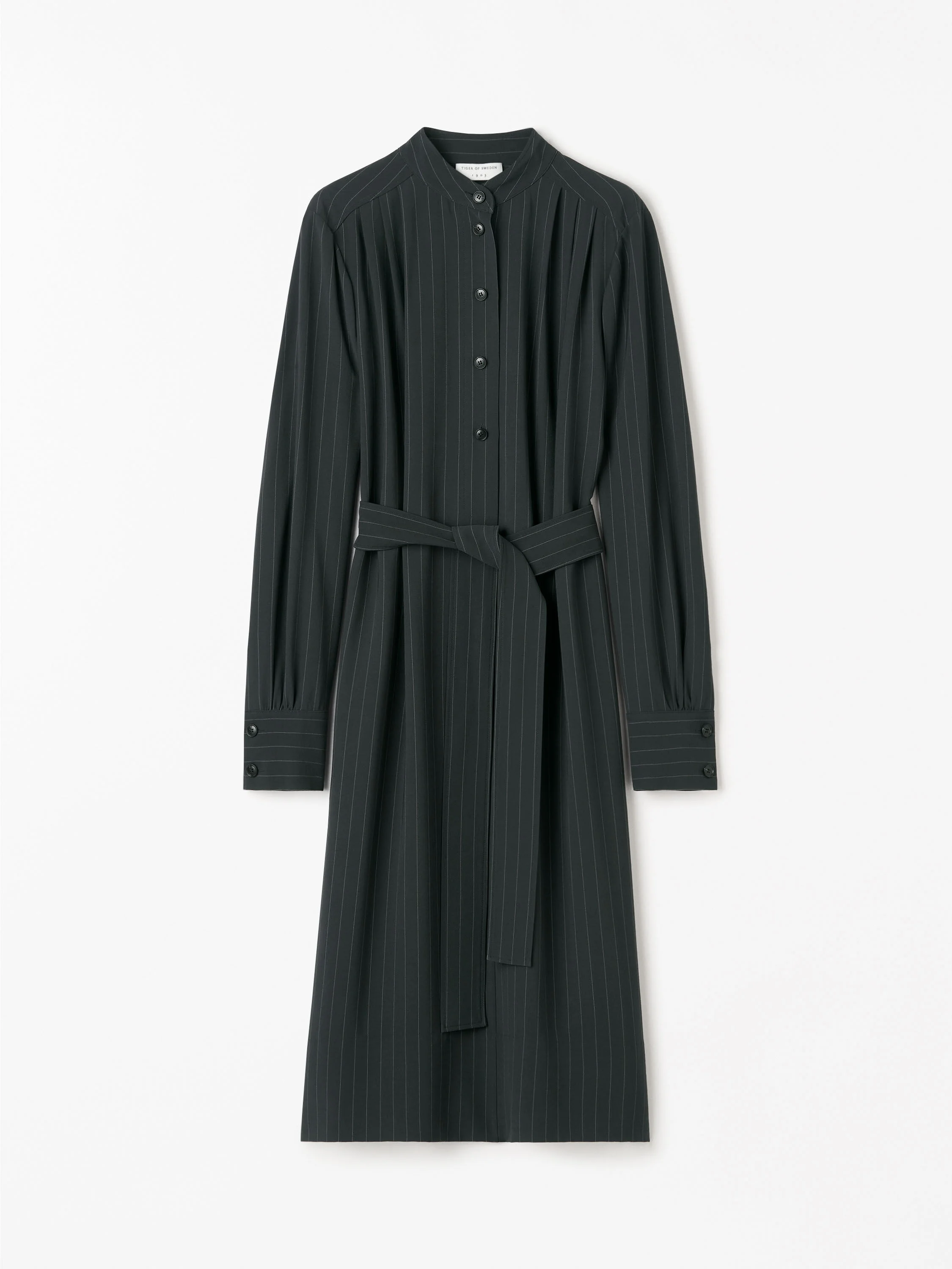 The Jodie dress is crafted from a tailored, drapy midweight fabric that offers both structure and fluidity. Designed for a relaxed, loose fit, it features a small stand-up collar and a half placket at the front with a classic button closure. The long sleeves are finished with cuffs and button fastenings, adding a touch of traditional tailoring. A double-layered back yoke enhances the silhouette, complemented by gentle gatherings at the front and back for subtle volume. The waist is defined with a wide belt threaded through belt loops, allowing for an adjustable fit. Practical details include side seam pockets and a back slit for ease of movement. The hem is curved and slightly longer at the back, giving the dress a refined yet effortless finish. Product Details - 91% Rayon, 8% Nylon, 1% Polyester - Shirt dress in a tailored drapy midweight fabric - Relaxed loose fit - Small stand-up collar - Half placket at front with button closure - Long sleeves with cuffs and button closure - Classic tailored buttons - Double layer back yoke with gatherings at front and back - Wide belt and beltloops at waist - Pockets at side seams - Slit at back - Curved bottom hem, slightly longer at back - Made in China - Model is 177 cm and wearing a size 36 - Art No.1133892Y9