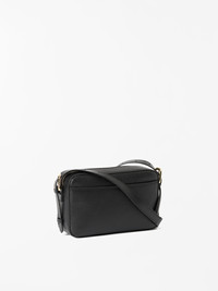 Product Details - 100% Calf Leather - Crossbody bag in grainy leather - Contrasting trim in smooth leather - Zipped pocket at front and open pocket at back - Single compartment featuring one zipped pocket and one open pocket - Adjustable shoulder strap on both sides of bag - Polyester lining - Size: 14 x 22 x 7 cm - Made in India - Art No.109727050