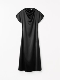 The Leilani dress is made from a Naia acetate satin blend. Naia acetate is a sustainable, bio-based cellulose acetate fibre, offering a luxurious feel and eco-friendly solution. The Leilani dress is crafted from a fluid heavy satin that falls to an elegant mid-calf length. Designed with a softly draped mid-high neckline and blossom-wrapped cap sleeves, it balances elegance with modern detail. Triangle inserts at the side seams create a subtle flare. Made from a drapey acetate satin with a rich, luxurious handfeel, the Leilani dress is available in Black and Army Petrol. Product Details - 75% Acetate, 25% Polyester - Funnel neck dress - Semi-relaxed fit at top with flared skirt silhouette - Centre back seam with zip closure and hook & eye - Fully lined, with funnelneck lined in shell fabric - Mid-calf length - Funnel neck - Short sleeved - Overlapping fabric detail at back of shoulders - Pleats on left shoulder - Diagonal cutlines at front and back of skirt - Art No.113698050