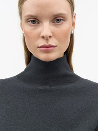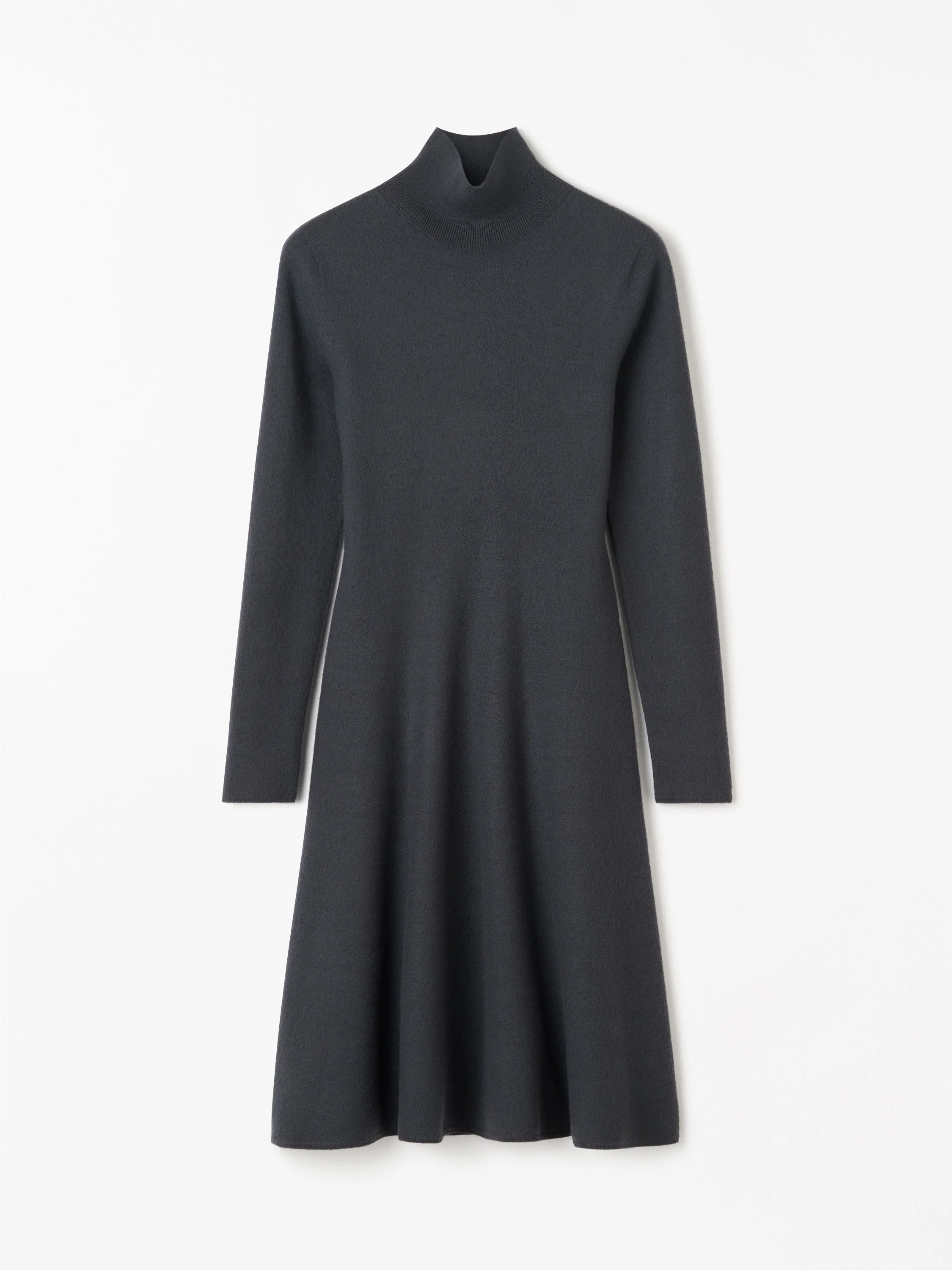 The Malaya is a seamless mock-neck dress crafted from 100% boiled Merino wool. The top features a regular fit with a clean mock neckline and long sleeves. Slightly shaped at the waist, the dress flares into a gently flowing skirt that falls to the knee. Designed with French shoulders and fully fashioned details for a refined finish. Unlined, with narrow rib trim at the hem and cuffs for a subtle touch of texture. The wool in this product is certified by the Responsible Wool Standard. Product Details - 100% Merino Wool - Seamless mock-neck dress, knitted in 100% Boiled Merino wool - Top of dress boasts a regular fit - Mock-neck finish at neckline - Long-sleeved and slightly fitted at waist - Skirt of dress is flared - Unlined and knee length - French shoulder with fully fashioned details - Bottom hem and sleeve is finished with a narrow rib trim - Responsible Wool Standard - Made in China - Model is 175 cm and wearing a size S - To complete the look, wear it with Conci Bag - Art No.1133582Y9