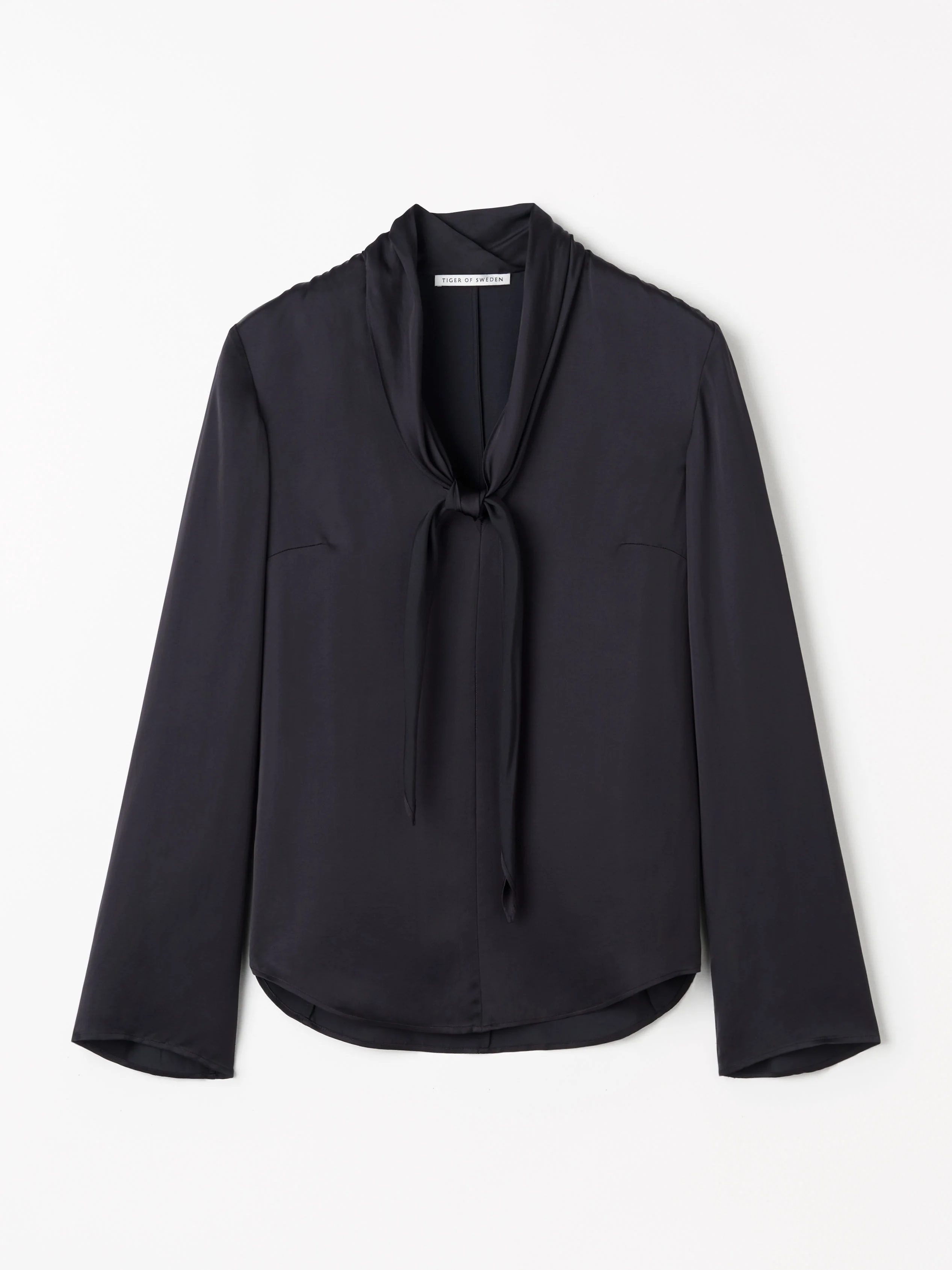 The Soren blouse is crafted from a drapey satin fabric that lends a smooth, elegant finish. Designed in a relaxed slim fit, it offers a flattering silhouette without feeling restrictive. The blouse is unlined for a lightweight feel and features a V-shaped neckline accented by an adjustable scarf detail attached at the back of the neck, adding a refined and versatile touch. Long sleeves with a subtle flared shape enhance its graceful appearance, while bust darts provide gentle structure. A curved bottom hem completes the look with a soft, feminine edge. Product Details - 64% Viscose, 36% Lyocell (Tencel (Tm)) - Blouse in drapey satin fabric - Relaxed slim fit - Unlined - V-shape neckline with adjustable scarf detail attached at back neck - Long sleeves with slightly flared shape - Bust darts - Curved bottom hem - Made in China - Model is 177 cm and wearing a size 36 - To complete the look, wear it with Hedvi Trousers - Art No.1133742Y9