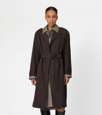 Oversize raglan-cut trench coat, composed of two garments that can be worn individually. The exterior is in water-repellent technical cotton, with belt, leather-covered buckle and welt pockets. The internal garment is in soft combed wool, featuring shirt collar, frogs on the shoulders and buttons with T-stitching. A style with a dual nature, elegant and functional. - Made in Italy - Double-layered trench coat - Fitting: over - Item composition: 77% cotton, 23% polyamide, lined parts 100% cotton, ovine leather detailing, second fabric 100% virgin wool - Maintenance and care cards included
