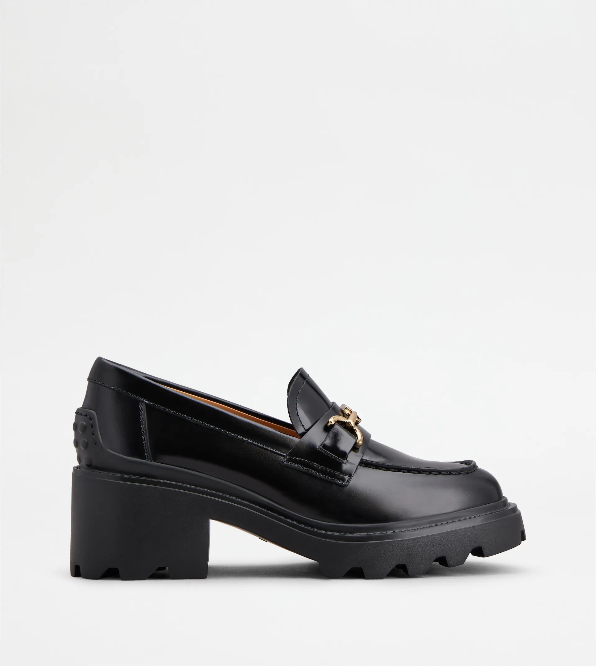 Loafers with heel and metal T-Clamp accessory. Featuring the distinctive rubber pebble detailing on the heel, this style in brushed calfskin leather is characterized by a rubber lugged outsole. - Made in Italy - Women's lugged loafers - Calfskin leather upper - Brushed finishing - Metal T-Clamp accessory - Calfskin leather lining and insole - Rubber pebble detailing on the heel - Rubber heel 2.4 ins - Rubber lugged outsole - Maintenance and care cards included - Branded dustbag