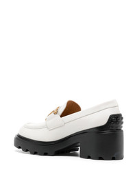 65mm logo-plaque leather loafers Highlights - White/black - Calf leather - Gold-tone logo plaque - Smooth grain - Round toe - Slip-on style - Branded leather insole - Non-slip sole - Mid block heel Made in Italy Composition Sole: Rubber 100% Lining: Calf Leather 100% Outer: Calf Leather 100% SIZE & FIT Measurement HEEL 2.36 in(6 cm) HEIGHT 2.55 in(6.5 cm) Sole height 0.98 in(2.5 cm)