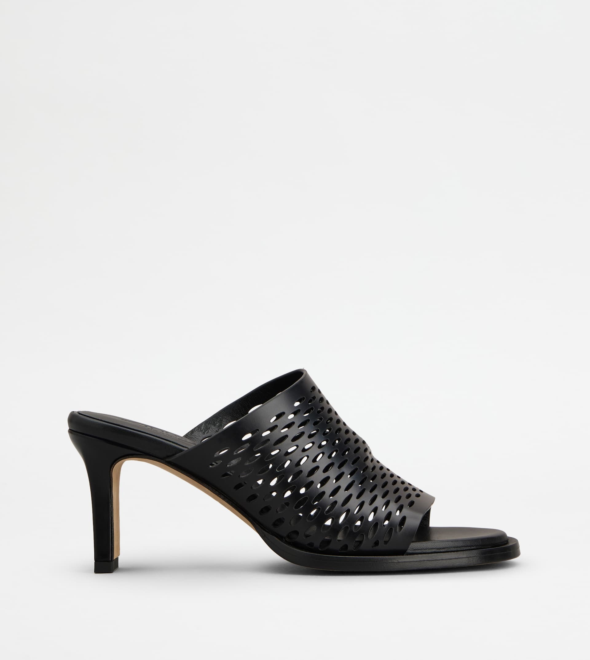 Open toe mules in perforated calfskin leather, with wraparound heel and leather outsole. A style with a minimal, feminine and versatile taste. - Made in Italy - Mules in leather - Calfskin leather upper - Leather lining and insole - Covered heel 3 ins - Leather outsole - Maintenance and care cards included - Branded dustbag