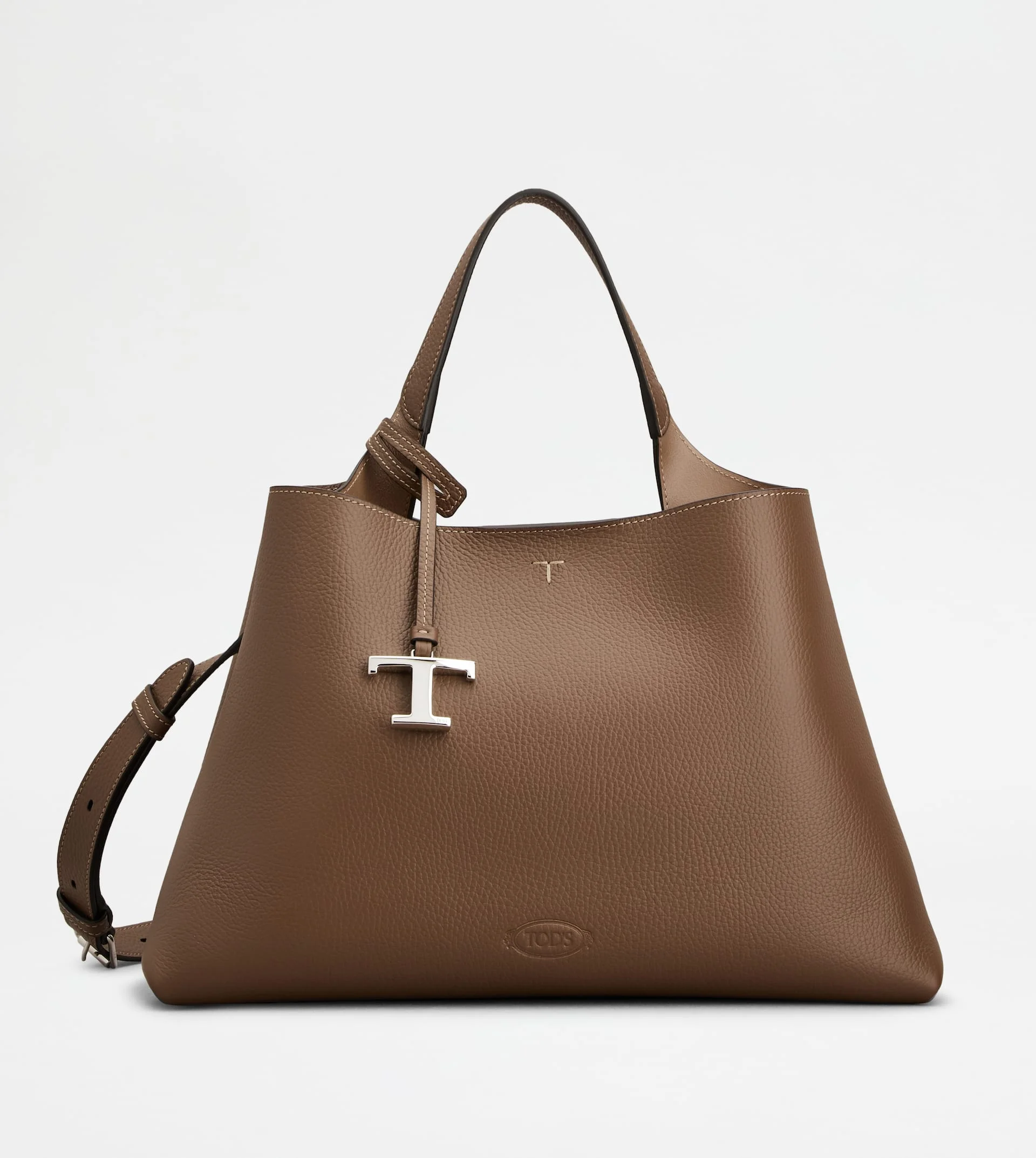 Bag in soft exposed-grained leather. Featuring a flat handle and adjustable shoulder strap, it comes with 2 compartments separated by central zipped pockets. A refined creation enriched by iconic detailing, such as the metal T Timeless pendant and T-stitching on the upper edge. - Dimensions: L 14.6 ins x H 9.4 ins x D 7.1 ins - Handle: height (drop) 6.9 ins - Adjustable shoulder strap: length (drop from the central hole) 19.7 ins - Made in Italy - Bag in leather - Item crafted in calfskin leather - Removable pendant with metal T Timeless accessory - Central T-stitching - Tod's logo stamped on the front - Snap hook closure - 2-compartment interior - 2 internal flat zipped pockets - Brande metal feet - Maintenance and care cards included - Branded dustbag