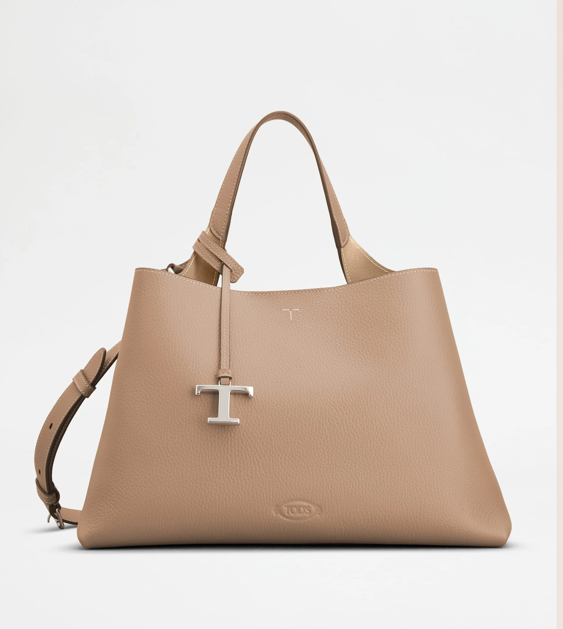 Bag in soft exposed-grained leather. Featuring a flat handle and adjustable shoulder strap, it comes with 2 compartments separated by central zipped pockets. A refined creation enriched by iconic detailing, such as the metal T Timeless pendant and T-stitching on the upper edge. - Dimensions: L 14.6 ins x H 9.4 ins x D 7.1 ins - Handle: height (drop) 6.9 ins - Adjustable shoulder strap: length (drop from the central hole) 19.7 ins - Made in Italy - Bag in leather - Item crafted in calfskin leather - Removable pendant with metal T Timeless accessory - Central T-stitching - Tod's logo stamped on the front - Snap hook closure - 2-compartment interior - 2 internal flat zipped pockets - Brande metal feet - Maintenance and care cards included - Branded dustbag