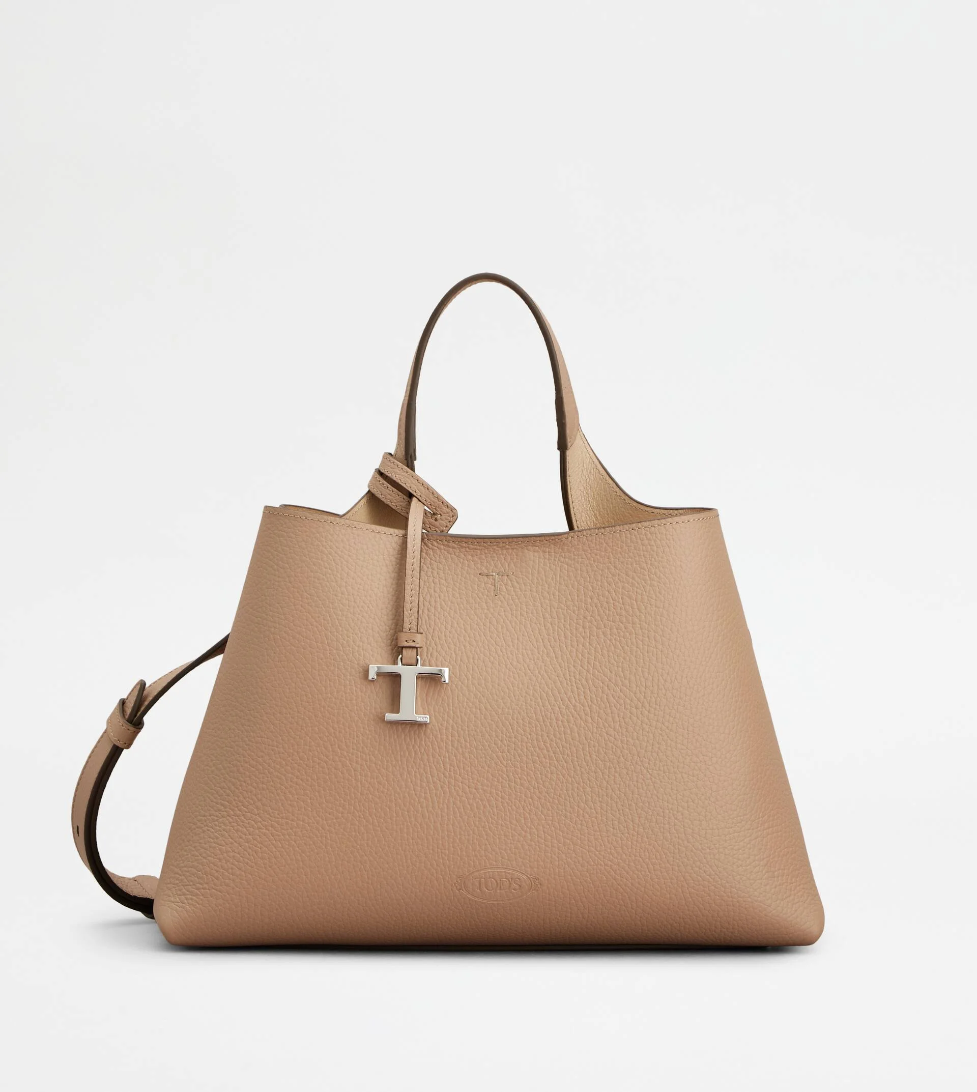 Bag in soft exposed-grained leather. Featuring a flat handle and adjustable shoulder strap, it comes with 2 compartments separated by central zipped pockets. A refined creation enriched by iconic detailing, such as the metal T Timeless pendant and T-stitching on the upper edge. - Dimensions: L 12.2 ins x H 8.1 ins x D 5.5 ins - Handle: height (drop) 5.1 ins - Adjustable shoulder strap: length (drop from the central hole) 18.5 ins - Made in Italy - Bag in leather - Item crafted in calfskin leather - Removable pendant with metal T Timeless accessory - Central T-stitching - Tod's logo stamped on the front - Snap hook closure - 2-compartment interior - 2 internal flat zipped pockets - Brande metal feet - Maintenance and care cards included - Branded dustbag