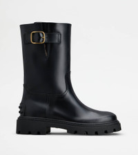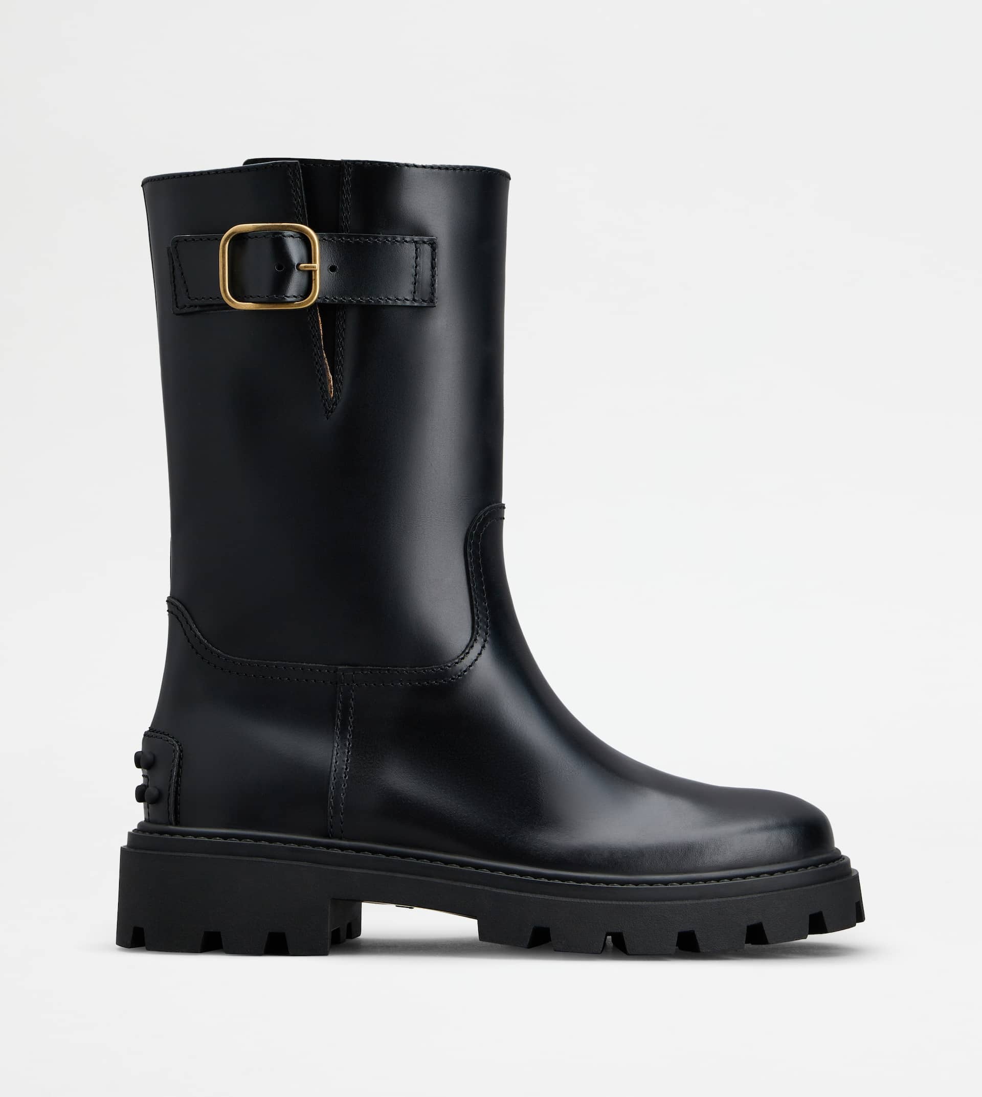 Biker boots in semi-shiny leather, with branded metal side buckle. Featuring the iconic rubber pebbles on the heel, they are characterized by a rubber lugged outsole. An urban passe-partout with a bold and refined touch at once. - Made in Italy - Women's lugged ankle boots - Leather upper - Branded metal side buckle - Rubber heel - Rubber lugged outsole - Maintenance and care cards included - Branded dustbag