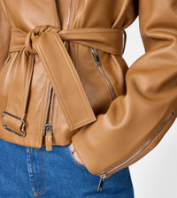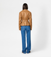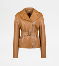 Biker in soft and velvety calfskin leather, with waist belt and branded metal buckle. Featuring zipped pockets and cuffs, it comes with the distinctive T-stitching on the fastening zip pull, recalled by the embroidery on the back. - Made in Italy - Biker in leather - Fitting: regular - The female model is 5' 9'' and wears size 38 (IT) - Item composition: 100% ovine leather, lining 100% cotton, second lining 100% viscose, padding 70% polyester, 30% polyethylene - Maintenance and care cards included