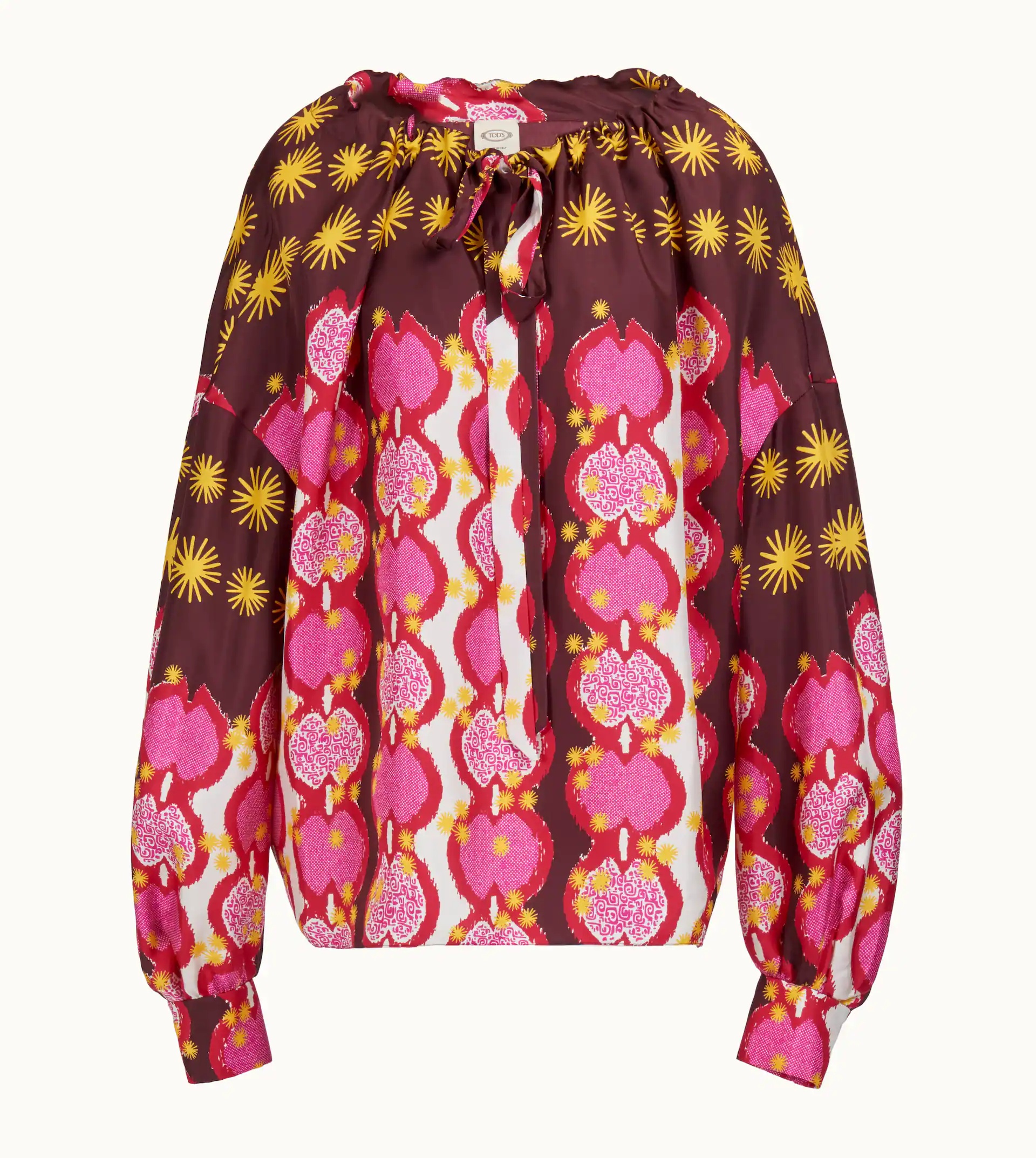 Blouse in a silk twill with a digital print and a neckline featuring laces. A vibrant and feminine item, with must-have detailing, such as mother-of-pearl buttoned cuffs. - Made in Italy - Women's Tod's Blouse - The model is 180 cm and wears IT size 40 - Item composition: 100% silk - Maintenance and care cards included