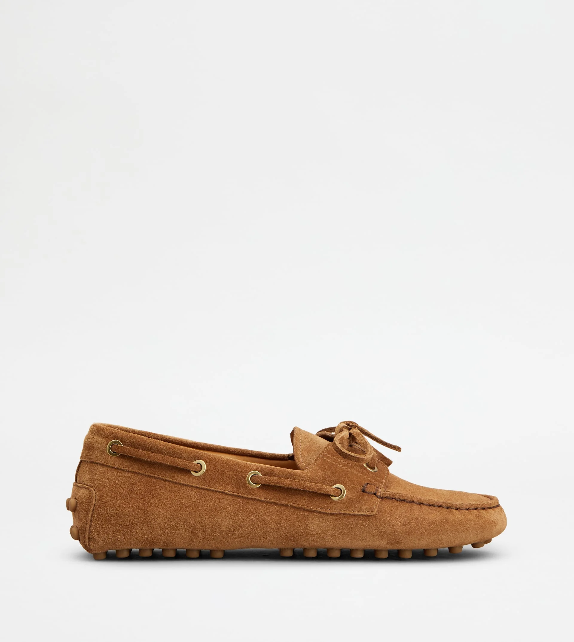 Tod's Gommino driving shoes interpret an informal and relaxed elegance. Result of careful craftsmanship, they come here in boat shoe version, with woven tie and metal eyelets. Crafted in soft suede, they come with the distinctive iconic rubber pebble outsole. - Made in Italy - Women's Boat Gommino - Calfskin suede upper - Woven tie - Leather lining and insole - Rubber pebble detailing on the heel - Iconic rubber pebble outsole - Maintenance and care cards included - Branded dustbag