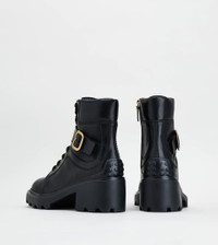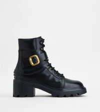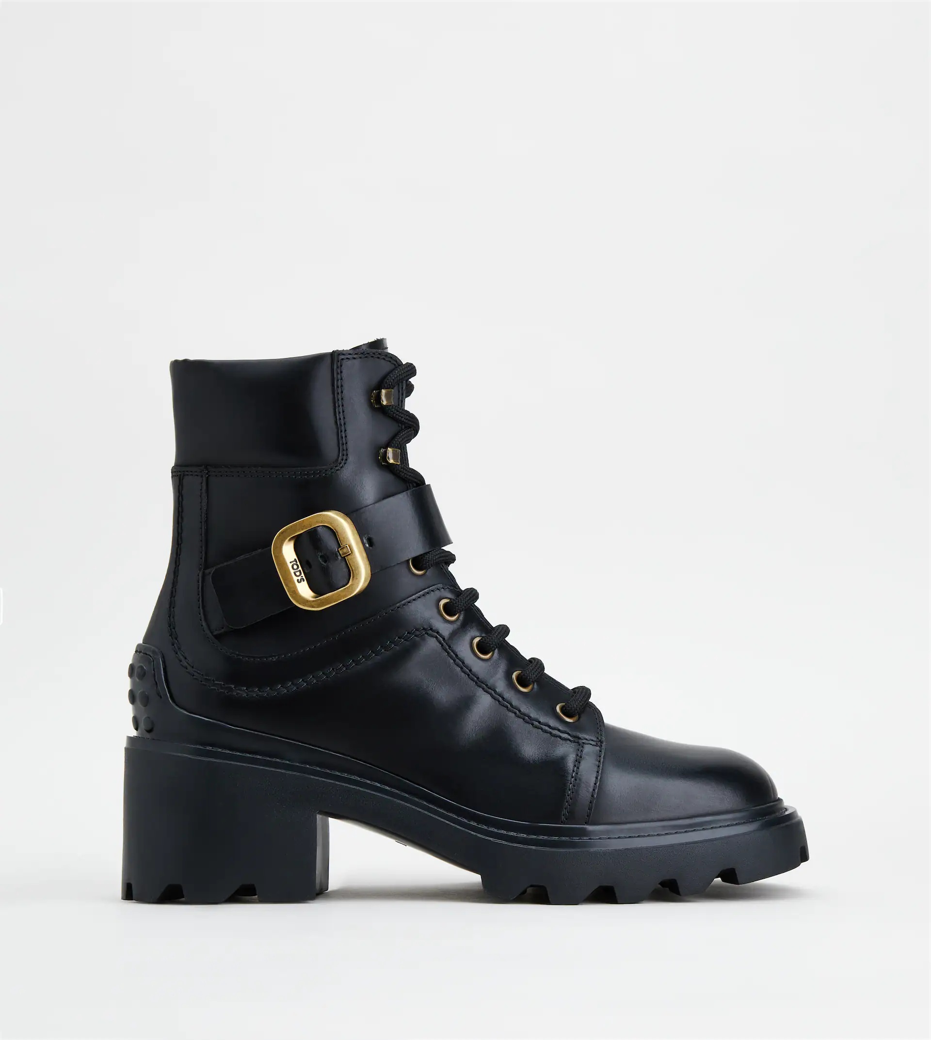 Laced boots in fine leather with strap and branded metal buckle. Rubber pebble detailing on the heel, rubber lugged outsole, tweed lining with houndstooth pattern. - Made in Italy - Women's Tod's boots - Leather upper - Padded top edge - Strap with branded metal buckle - Zip on the inside - Rubber pebble detailing on the heel - Wool blend fabric lining - Rubber heel 6 cm - Rubber lugged outsole - Maintenance and care cards included - Branded dustbag