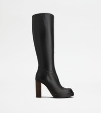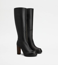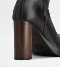 Boots in calfskin leather with tapered line, wooden heel and rubber outsole with embossed detailing. Elegant and bold at once, they come with biker world-inspired detailing, such as the pronounced welt and the band with covered snap, which conceals the zip pull on the inside. - Made in Italy - Women's boots - Calfskin leather upper - Zip and snap closure - Leather lining and insole - Wooden heel 3.9 ins - Rubber outsole with embossed detailing - Maintenance and care cards included - Branded dustbag