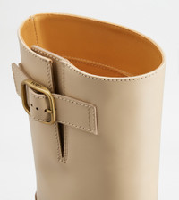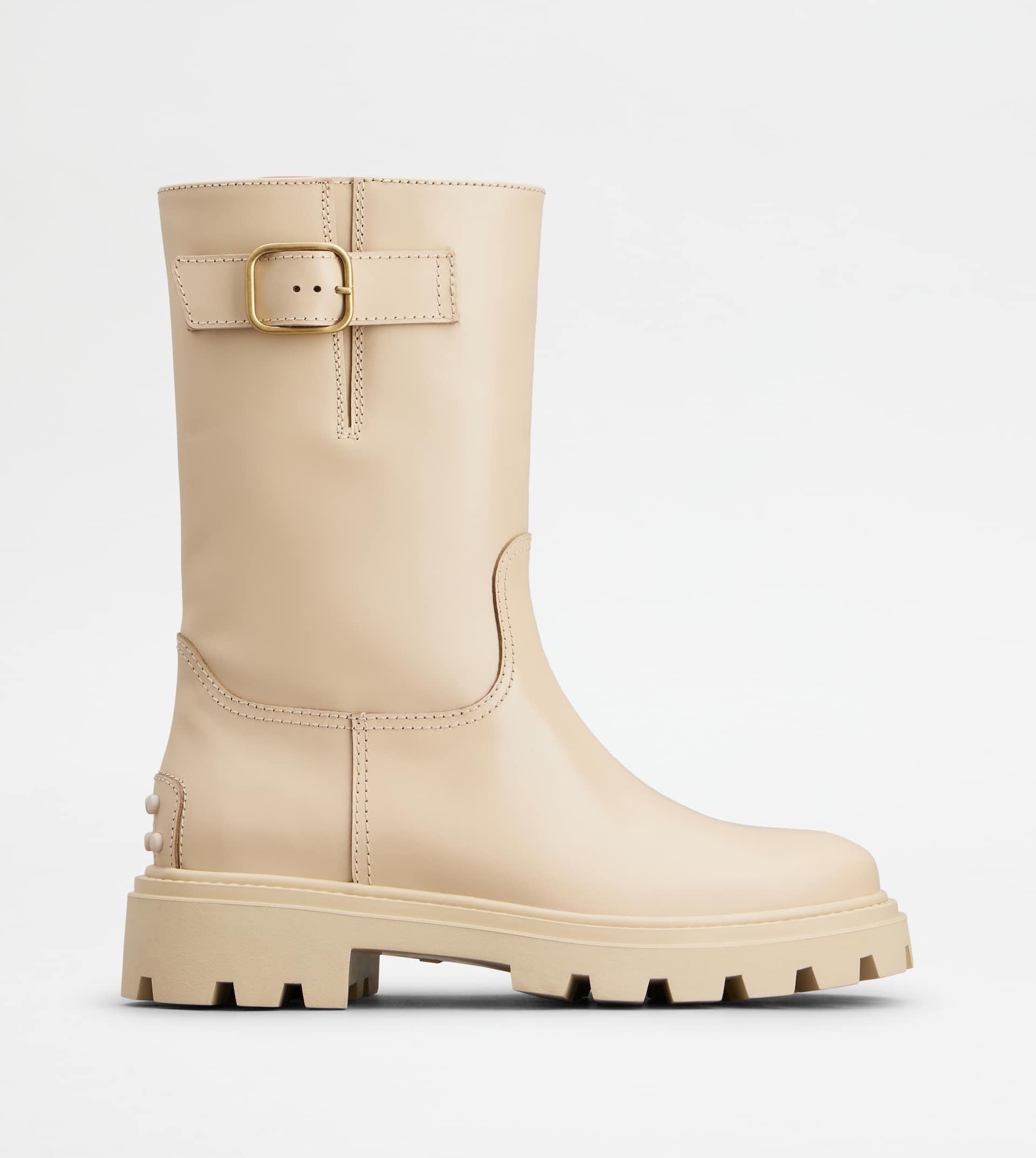 Biker boots in semi-shiny leather, with branded metal side buckle. Featuring the iconic rubber pebbles on the heel, they are characterized by a rubber lugged outsole. An urban passe-partout with a bold and refined touch at once. - Made in Italy - Women's lugged ankle boots - Leather upper - Branded metal side buckle - Rubber heel - Rubber lugged outsole - Maintenance and care cards included - Branded dustbag