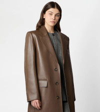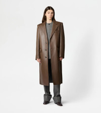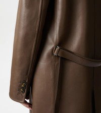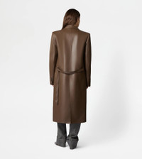 Coat in soft nappa leather with classic lapels and waist belt. Characterized by a breast pocket and flap pockets, it comes with a three-button fastening secured with T-stitching. A metropolitan garment that blends sartorial inspiration and contemporary allure. - Made in Italy - Coat in leather - Fitting: slightly oversized - The model is 5' 9'' and wears size 40 (IT) - Item composition: 100% ovine leather, interior 100% viscose (double manufacturing) - Maintenance and care cards included