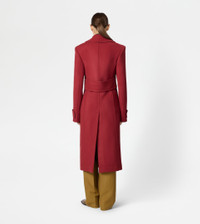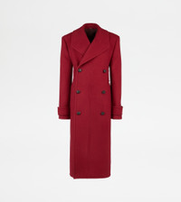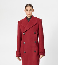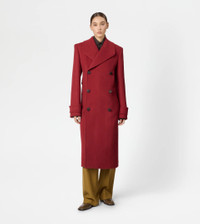 Characterized by wide lapels and leather-covered buttons, this double-breasted coat in wool features two welt pockets and a leather undercollar with stitching. Complemented by frogs on the cuffs, it is a versatile garment, with an elegant and sophisticated allure. - Made in Italy - Coat in wool - Fitting: regular - The model is 5' 9'' and wears size 38 (IT) - Item composition: 100% virgin wool, lining 100% viscose, ovine leather detailing - Maintenance and care cards included