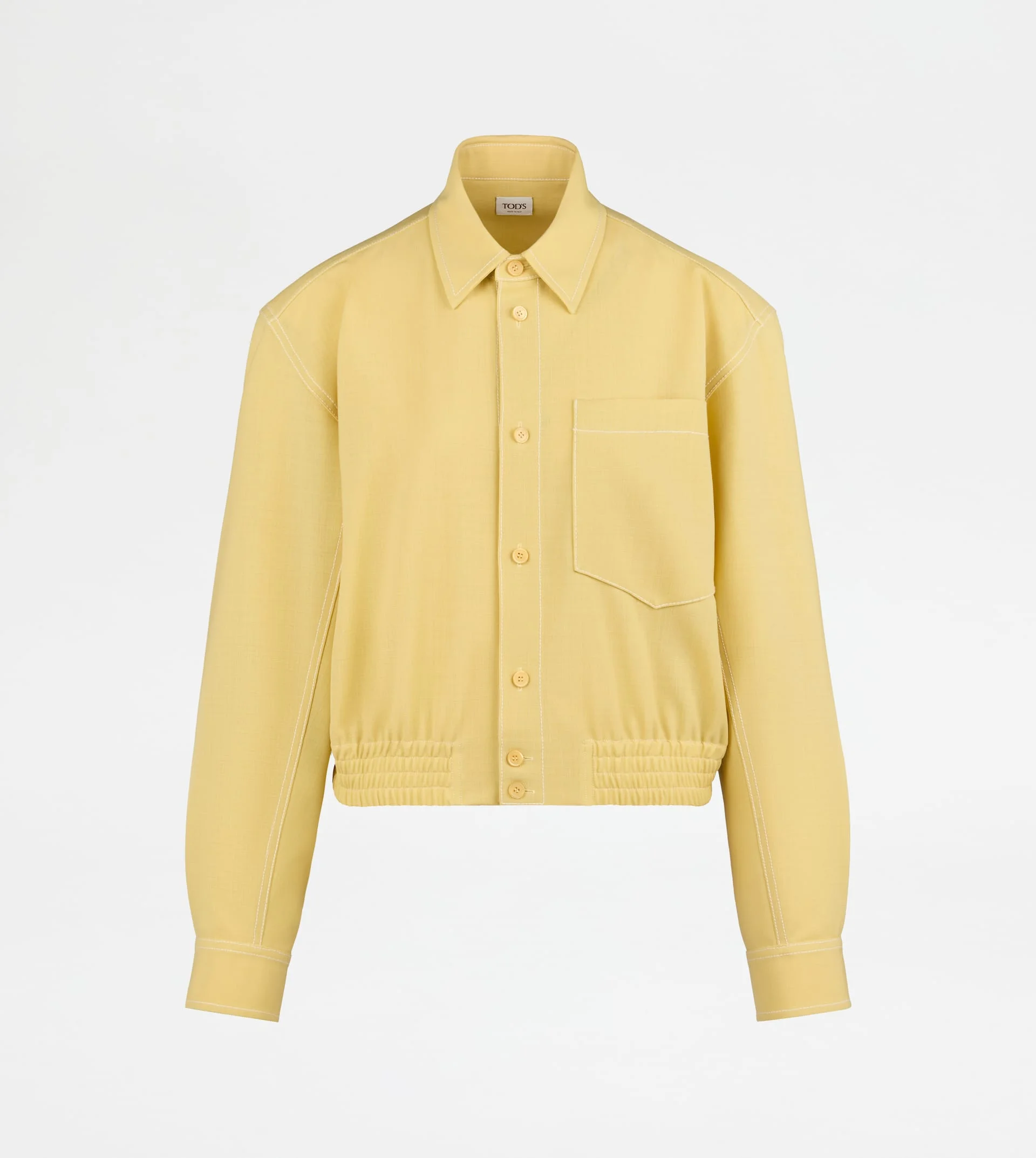 Bomber-cut overshirt with pointed collar and slightly dropped shoulder. Crafted in twisted fiber wool canvas, it comes with an applied pocket, branded buttons and elastic bottom hem. - Made in Italy - Short shirt-jacket - Fitting: comfort - The female model is 5' 9'' and wears size 40 (IT) - Item composition: 100% virgin wool - Maintenance and care cards included