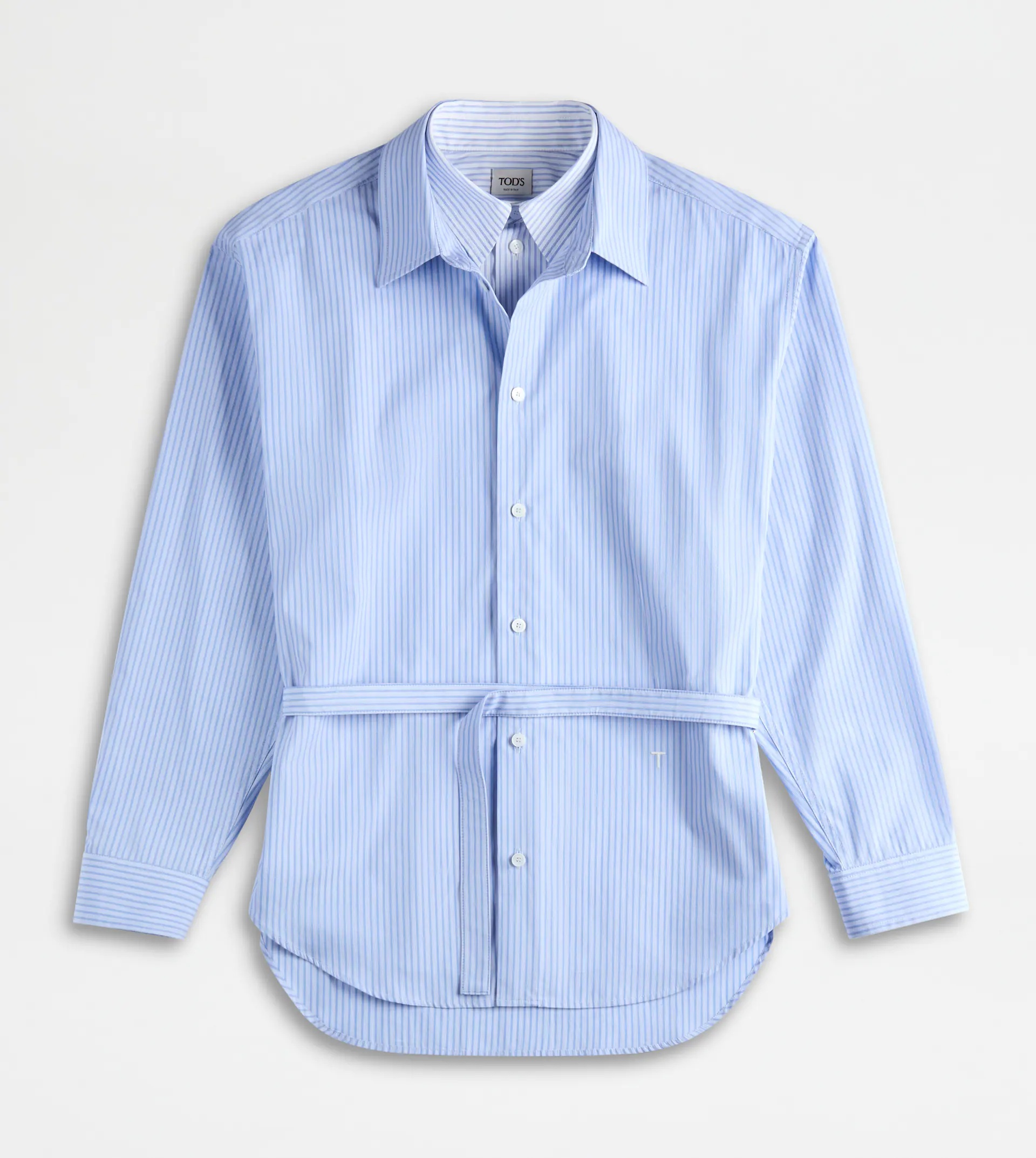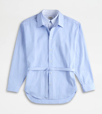 Characterized by a double collar and adjustable waist belt, this shirt in striped poplin is enriched by the Tod's monogram embroidered on the front. Fastened with mother-of-pearl buttons, it is an original over-cut style, with a slightly dropped shoulder and rounded bottom. - Made in Italy - Shirt in cotton - Fitting: regular - Item composition: 100% cotton - Maintenance and care cards included