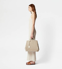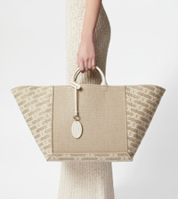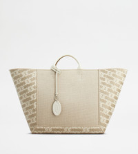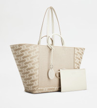 Shopping bag in linen and cotton, with iconic jacquard chain pattern. Featuring two tubular and two leather handles, it is complemented by a removable internal pouch. The oval pendant with stamped Tod's logo enriches this creation with a refined summer mood. - Dimensions: L 27.6 ins (extended compartment) x H 12.2 ins x D 5.5 ins - Short handles: height (drop) 3.7 ins - Long handles: height (drop) 12.2 ins - Made in Italy - Summer shopping bag - Item crafted in linen and cotton - Calfskin leather inserts - Removable pendant with stamped Tod's logo - Snap closure - Microfiber interior - Removable zipped pouch in leather - Maintenance and care cards included - Branded dustbag