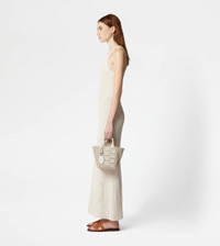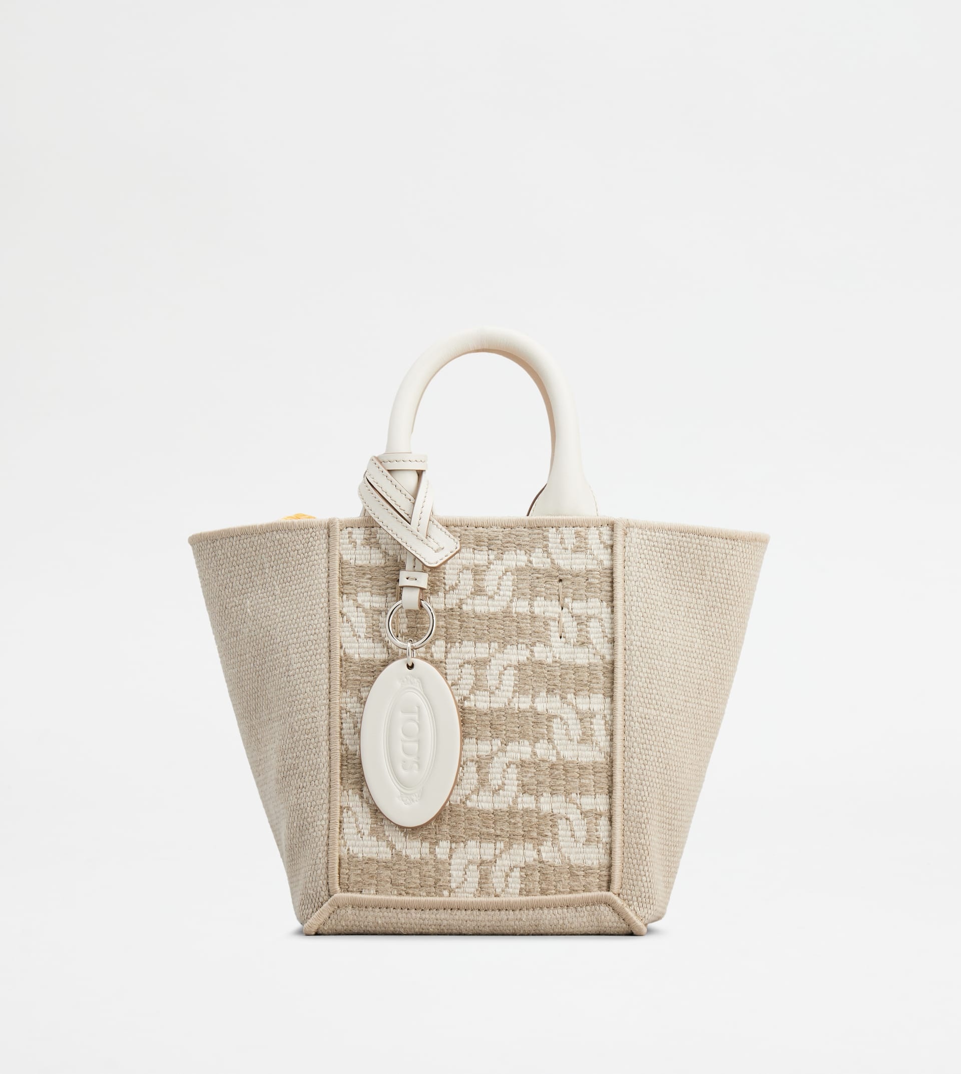 Mini shopping bag in linen and cotton, with iconic jacquard chain pattern. Featuring two leather handles fixed with maxi T-stitching, it comes with an adjustable and removable shoulder strap. The oval pendant with stamped Tod's logo enriches this creation with a refined summer mood. - Dimensions: L 10.6 ins x H 6.7 ins x D 4.7 ins - Handles: height (drop) 3.5 ins - Adjustable and removable shoulder strap: height (drop from central hole) 18.9 ins, length max 44.1 ins - Made in Italy - Summer mini shopping bag - Item crafted in linen and cotton - Calfskin leather inserts - Removable pendant with stamped Tod's logo - Microfiber interior - Maintenance and care cards included - Branded dustbag