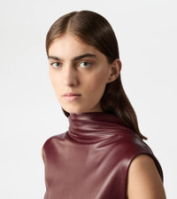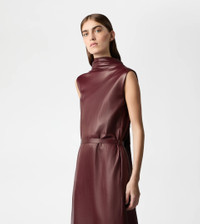 Sleeveless midi dress in soft nappa leather, with waist belt. Characterized by a waterfall of fringes at the back, it interprets a sophisticated femininity. - Made in Italy - Dress with fringes - Fitting: regular - The model is 5' 9'' and wears size 40 (IT) - Item composition: 100% ovine leather - Maintenance and care cards included