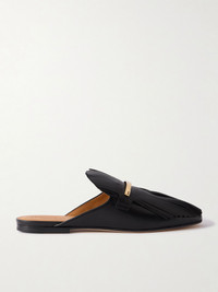 Tod's meticulous craftsmanship really shines through in its refined designs. These slippers have been made in Italy from soft leather in a backless, slip-on profile and are topped with tactile fringing, held in place by sleek logo-engraved bars. Wear them with tailored pants or shorts. Size & Fit - Fits true to size, take your normal size - Italian sizing Details & Care - Slight heel - Black leather - Slip on
