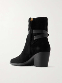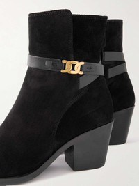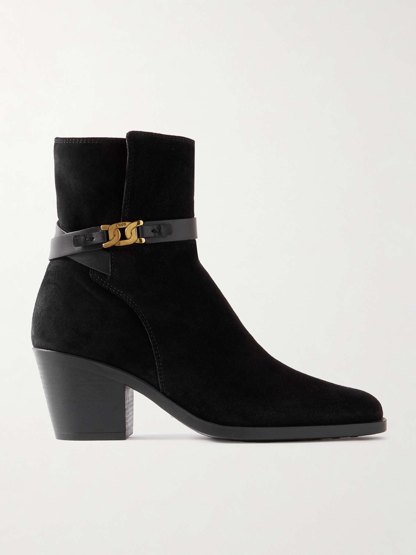 EDITORS'NOTES The leather straps on Tod's ankle boots are embellished with a gold-tone chain – look closer and you'll notice the middle link is etched with the house's moniker. Crafted in Italy from panels of suede, they rest on 65mm block heels and have side zippers to ensure easy on and off. SIZE & FIT - Fits true to size, take your normal size - Italian sizing DETAILS & CARE - Heel measures approximately 65mm/ 2.5 inches - Black suede and leather - Concealed zip fastening along side