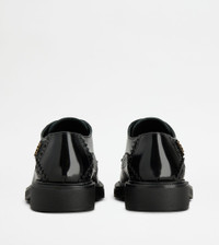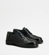Lace-ups in calfskin leather, tongue with Tod's logo, English style wing-tip perforations and rubber outsole with embossed rubber pebbles. - Made in Italy - Women's Tod's Lace-ups - Calfskin leather upper - English style wing-tip perforations - Side tongue with logo - Wool lining and insole - Rubber heel - Rubber outsole - Maintenance and care cards included - Branded dustbag