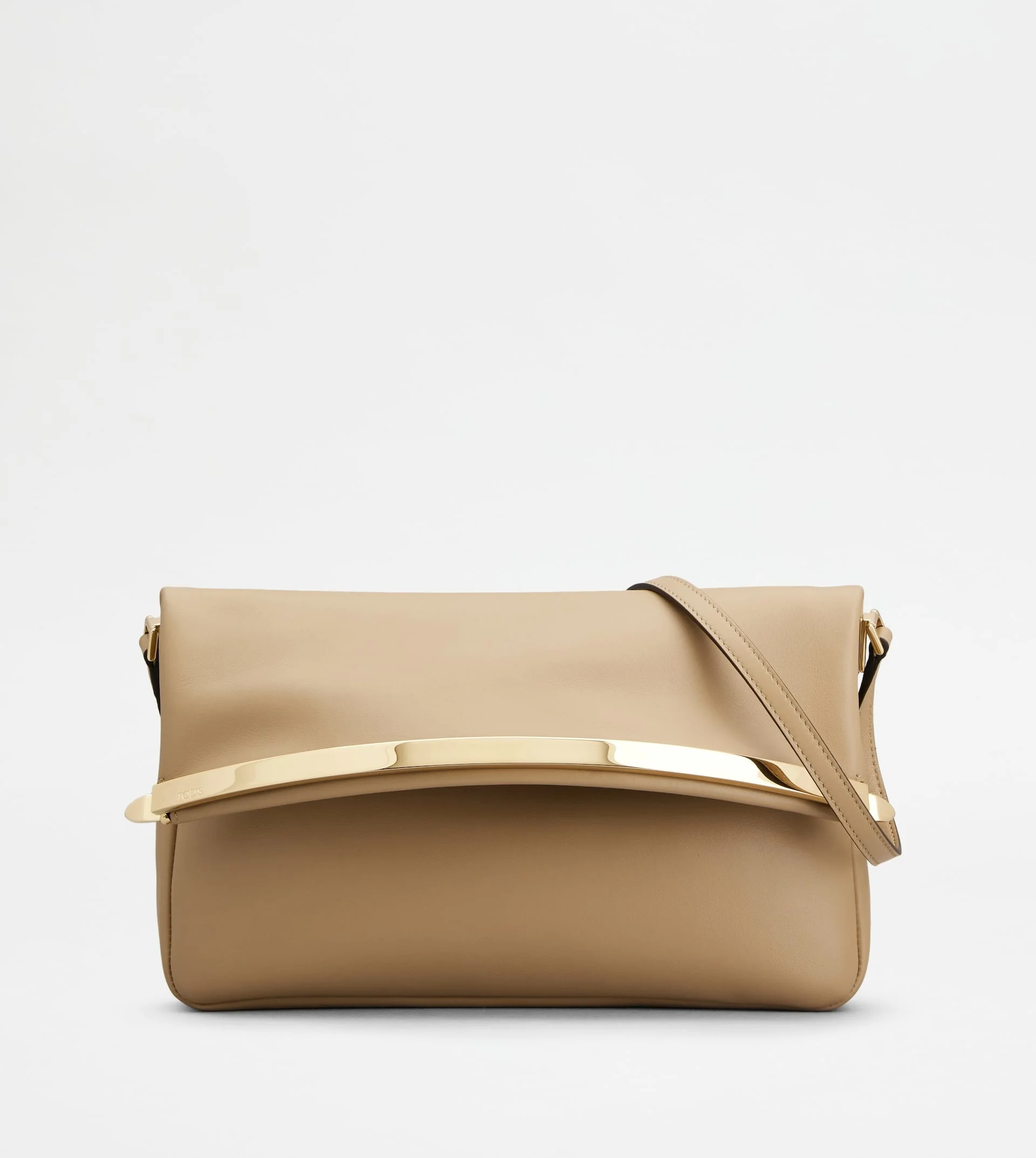 An elegant metal bar is the closing element of this shoulder bag with minimal lines. The essentiality of this style's shapes is emphasized by a particularly precious calfskin leather. Featuring an adjustable handle, it comes with a practical zip under the flap with access to the internal compartment. - Dimensions: L 12.2 ins x H 6.3 ins x D 2.4 ins - Adjustable handle: height (drop from the central hole) 13 ins - Made in Italy - Shoulder bag in leather - Item crafted in calfskin leather - Snap closure with metal bar and side straps - Zip under the flap - Maintenance and care cards included - Branded dustbag