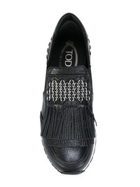 fringed slip-on sneakers Both stylish and functional thanks to the impeccable Italian craftsmanship we’ve come to expect from the label, these Tod’s sneakers interpret the brand’s heritage in a sophisticated yet casual way. Expertly constructed from textured black leather punctuated with delicate silver-tone eyelets, this chic slip-on style boasts a round toe, a fringed flap, elasticated side inserts and a brand embossed insole. Lightly padded at the ankle and set on white rubber soles dotted with the house’s famous pebbles, they’re a luxurious and comfortable option for everyday wear. Made in Italy Composition Sole: Rubber 100% Outer: Leather 100% Lining: Leather 100%