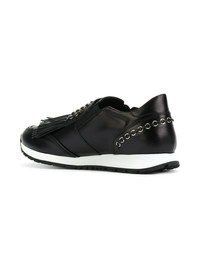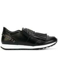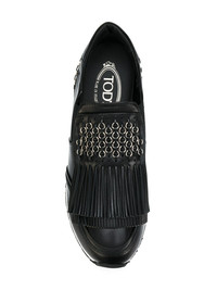 fringed slip-on sneakers Both stylish and functional thanks to the impeccable Italian craftsmanship we’ve come to expect from the label, these Tod’s sneakers interpret the brand’s heritage in a sophisticated yet casual way. Expertly constructed from supple black leather punctuated with delicate silver-tone eyelets, this chic slip-on style boasts a round toe, a fringed flap, elasticated side inserts and a brand embossed insole. Lightly padded at the ankle and set on white rubber soles dotted with the house’s famous pebbles, they’re a luxurious and comfortable option for everyday wear. Made in Italy Composition Sole: Rubber 100% Lining: Leather 100% Outer: Leather 100%