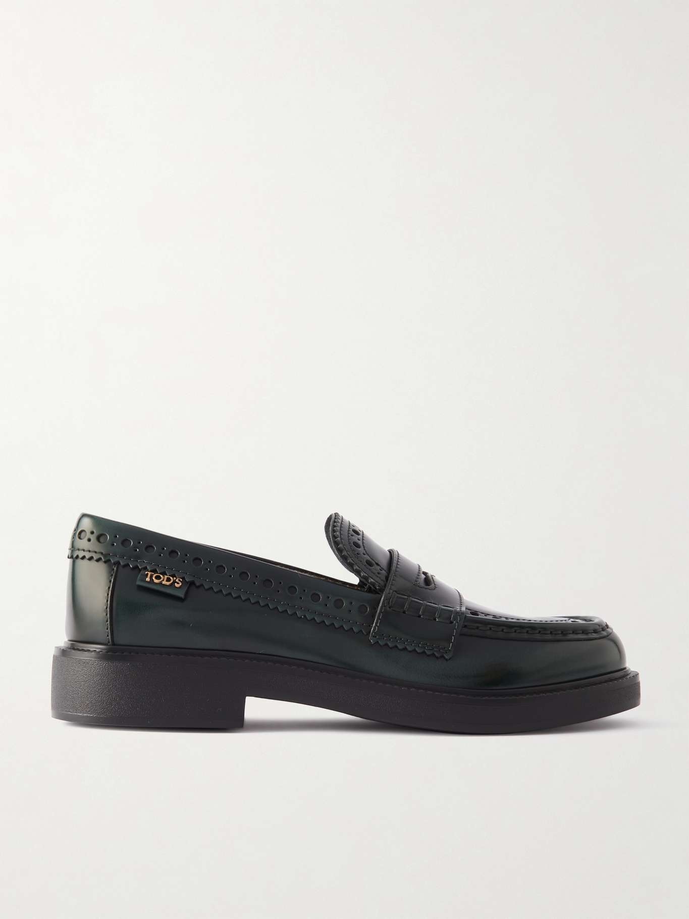 EDITORS'NOTES The latest addition to its 'Gomma' range, Tod's loafers have classic penny tabs and wingtip-inspired detailing typically seen on brogues. They've been crafted in Italy from smooth leather and sit on gripped soles. The dark-green works especially well with neutrals. SIZE & FIT - Fits true to size, take your normal size - Italian sizing DETAILS & CARE - Heel measures approximately 20mm/ 1 inch - Dark-green leather (Calf) - Slip on