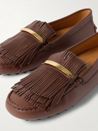 Tod's loafers are defined by their tactile fringing, held together by a gold-tone bar – look closer and you'll notice it's engraved with the label's logo. They've been made in Italy from leather and rest on 'Gommino' pebbled soles that extend up the heels. Size & Fit - Fits true to size, take your normal size - Only available in full sizes, go up to the nearest whole size if you take a half size - Italian sizing Details & Care - Slight heel - Brown leather (Calf) - Slip on