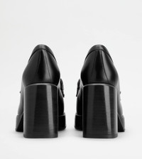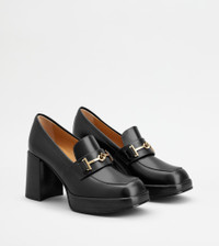 Characterized by a leather platform outsole, these loafers with block heel come with the metal double T accessory. Crafted in semi-shiny leather, they interpret a timeless informal elegance. - Made in Italy - Heeled loafers - Leather upper - Semi-shiny finishing - Metal double T accessory - Leather insole - Leather heel 3.3 ins - Leather platform outsole with rubber insert - Maintenance and care cards included - Branded dustbag