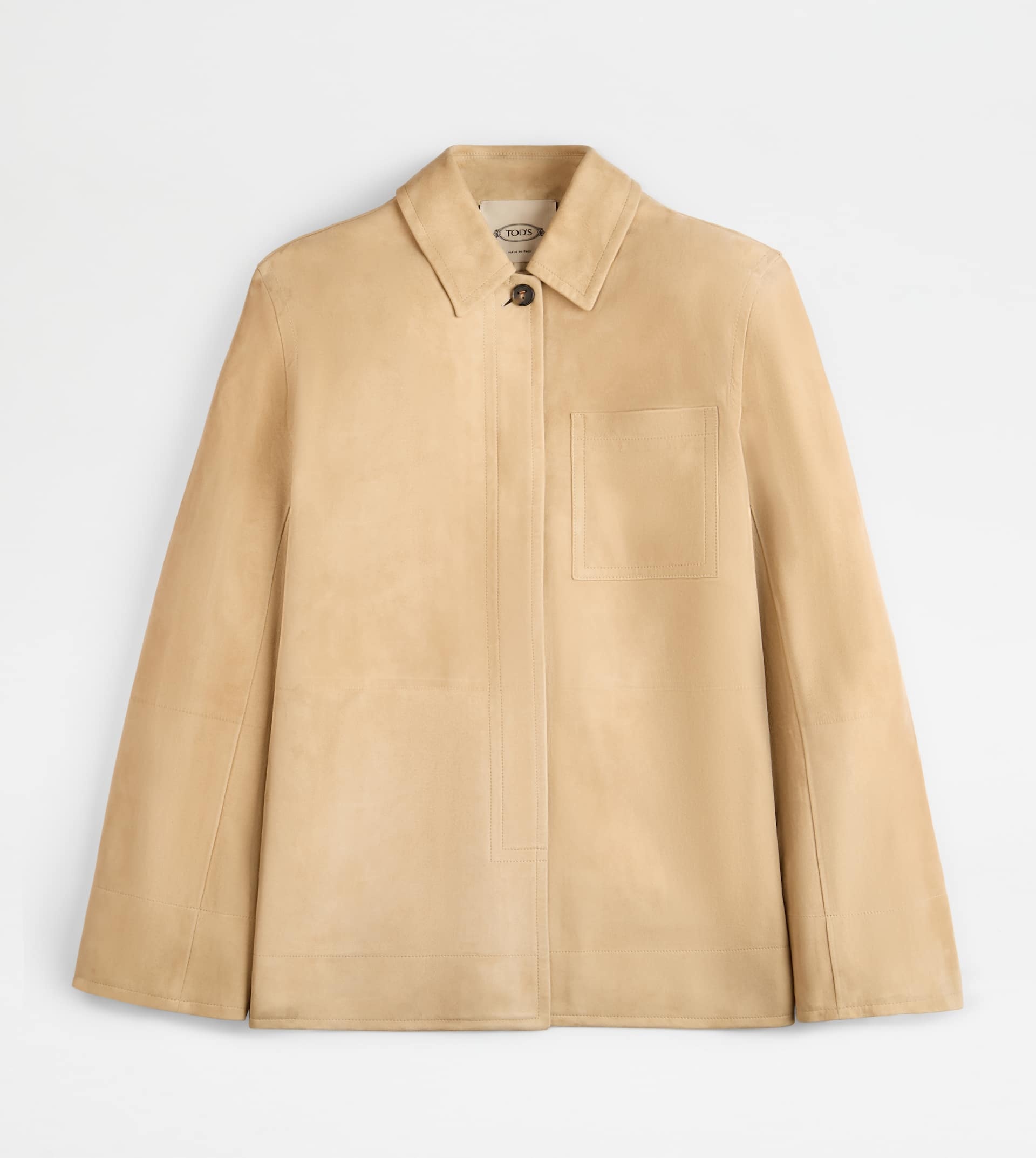 Craftmanship and contemporary femininity come together in this slim-fit jacket, crafted in soft suede. Featuring a shirt collar and applied breast pocket, it comes with a fastening with buttons secured with the distinctive T-stitching, covered with mock English style. - Made in Italy - Jacket in suede - Item composition: 100% ovine leather, calfskin leather detailing - Maintenance and care cards included