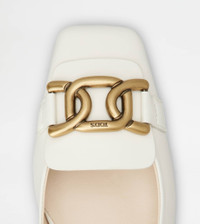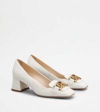 Pumps in calfskin leather, with squared toe and iconic branded metal chain accessory. Featuring a covered medium heel and leather outsole, they are a refined style that combines comfort and elegance. - Made in Italy - Pumps in leather - Calfskin leather upper - Branded metal chain accessory - Leather insole - Covered heel 2 ins - Leather outsole - Maintenance and care cards included - Branded dustbag