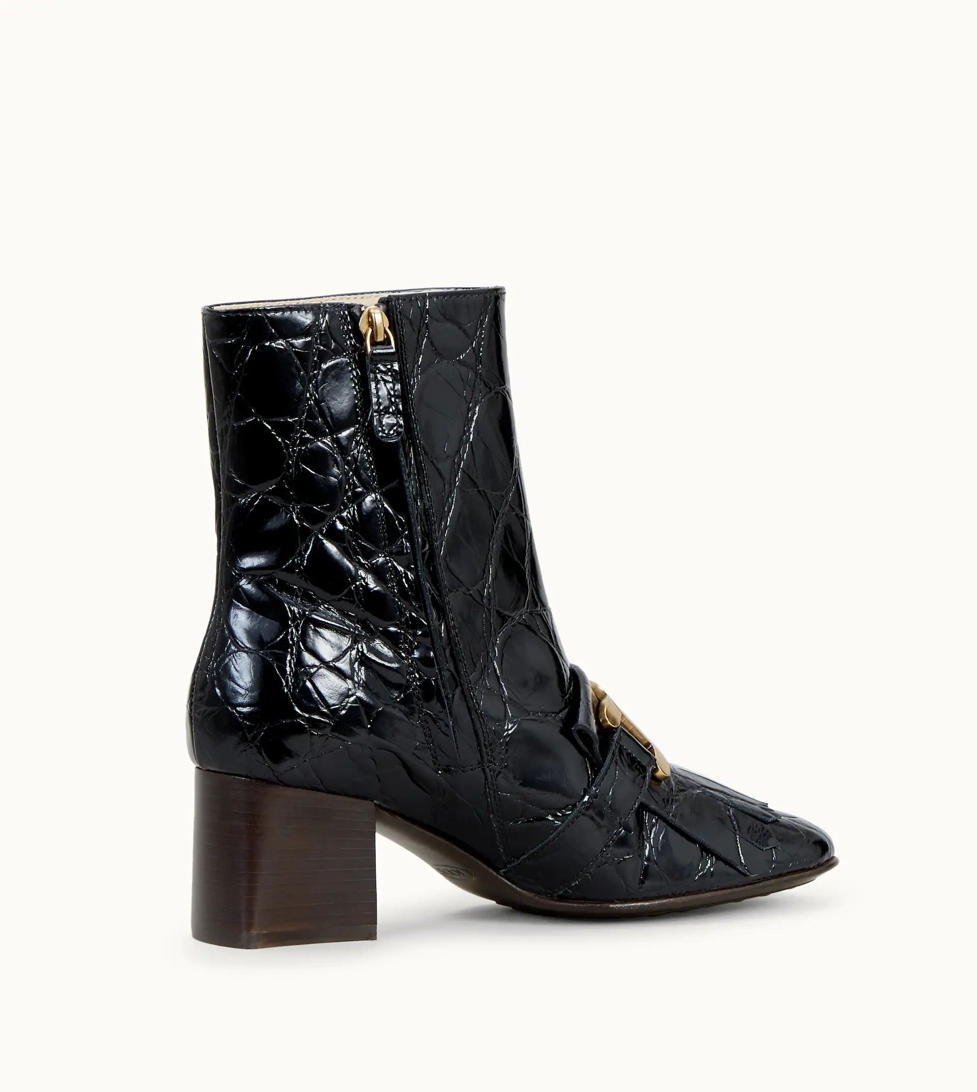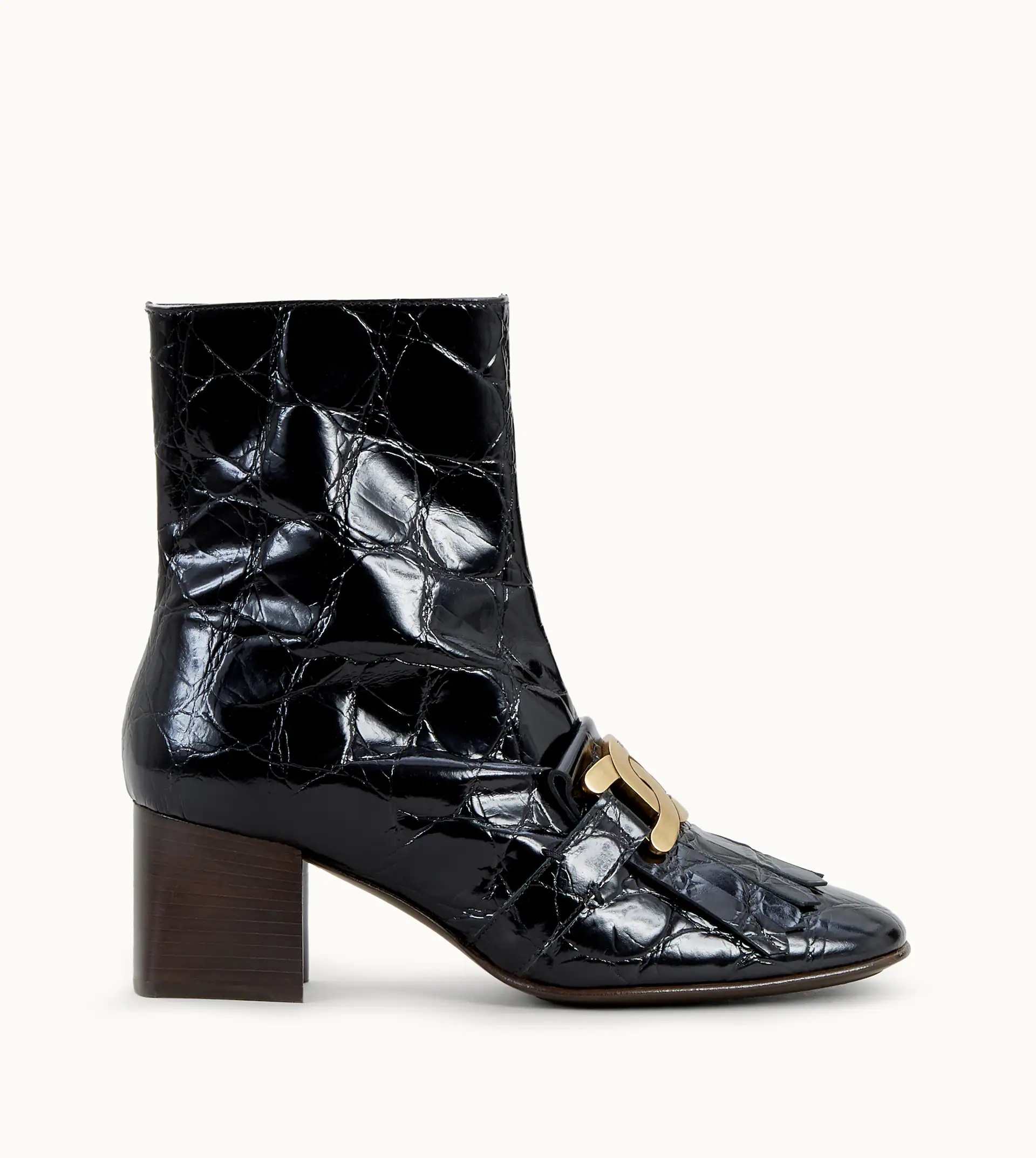 Ankle boots in elegant, crocodile-printed leather with fringe, metal branded chain accessory, side zip and a leather outsole with rubber injection. - Made in Italy - Women's Tod's Kate Ankle Boots - Leather upper - Crocodile print - Fringe - Tod's metal branded accessory - Side zip - Leather covered heel 6 cm - Leather outsole with rubber injection - Maintenance and care cards included - Branded dustbag