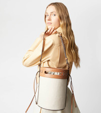 Characterized by a shaped trim inspired by the iconic chain accessory, this bucket bag comes with an adjustable handle with branded rivets. Crafted in calfskin leather and linen blend canvas, it comes with the maxi Tod's logo stamped on the bottom. Closed with a practical drawstring, it complements your summer outfit with the elegance of natural shades and essential lines. - Dimensions: L 6.9 ins x H 9.1 ins x D 6.9 ins - Handle: height (drop from central hole) 11 ins - Made in Italy - Bucket bag - Item crafted in calfskin leather - Cotton blend linen inserts - Tod's logo stamped on the bottom - Branded metal feet - Maintenance and care cards included - Branded dustbag